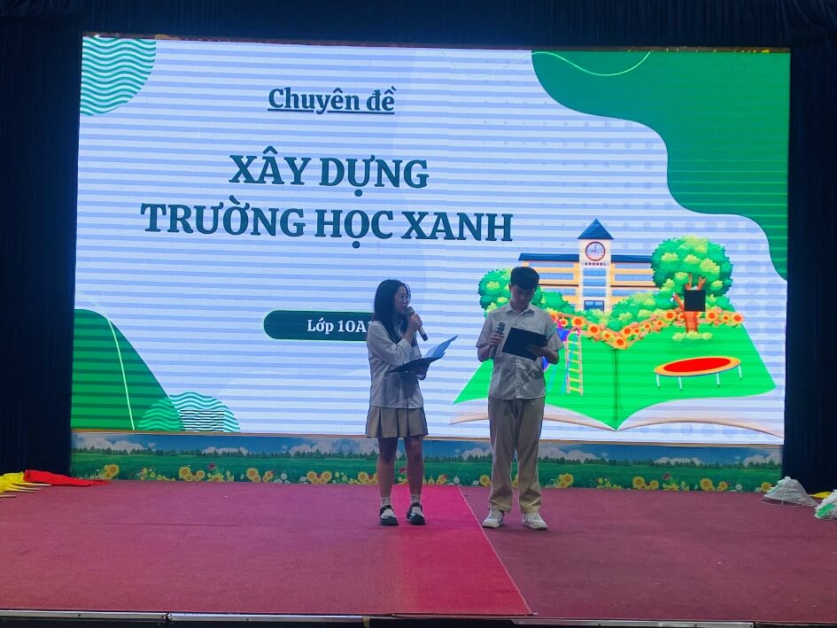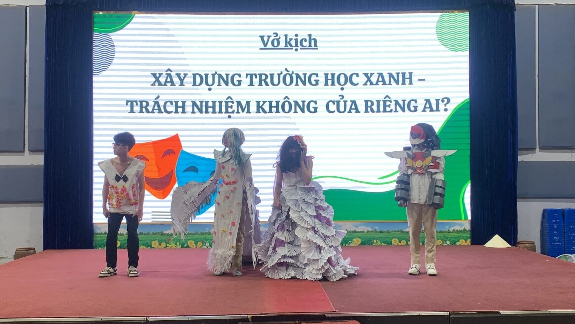 Sau đó các bạn học sinh và thầy cô đã được hiểu hơn về vấn đề ngôi trường sẽ không tự nhiên Xanh, cũng không tự nhiên mà Sạch được như vậy. Đó là công sức của biết bao người và cũng là trách nhiệm của tất cả chúng ta qua vở kịch “XÂY DỰNG TRƯỜNG HỌC XANH – TRÁCH NHIỆM CỦA RIÊNG AI?”. Chưa dừng lại ở đó, 10A1 còn gây bất ngờ về sự dí dỏm, sáng tạo và tài năng trong bộ sưu tập Hành Tinh Xanh của các nhà thiết kế đến từ Tương lai . Bộ sưu tập được lấy cảm hứng từ vô vàn các phế liệu đã không còn giá trị thế nhưng dưới bàn tay khối óc sáng tạo của các nhà thiết kế đại tài thì bỗng chốc chúng lại hóa thành những trang phục cực kì sang trọng và mới lạ.