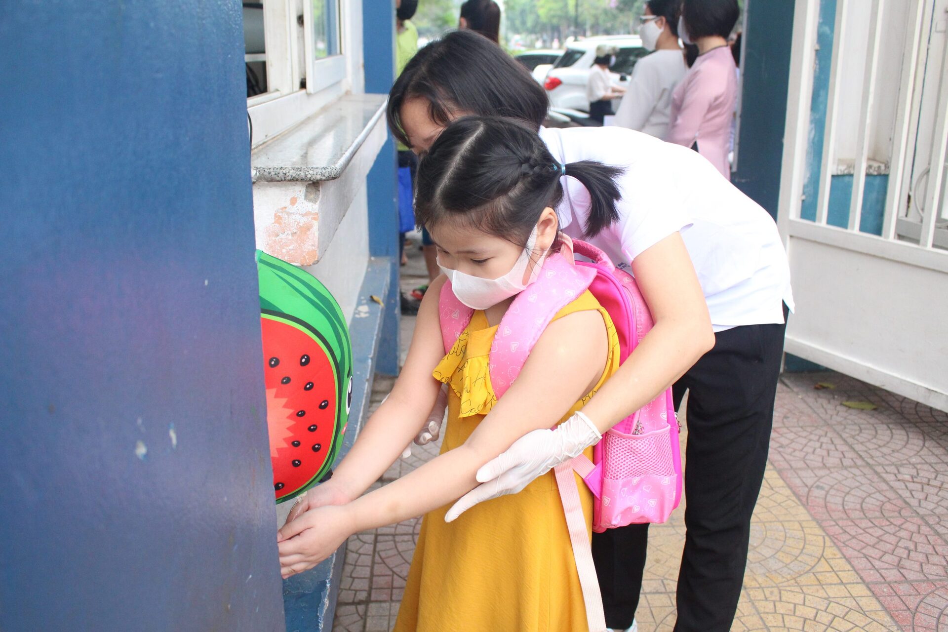 Các con được kiểm tra thân nhiệt trước khi vào lớp