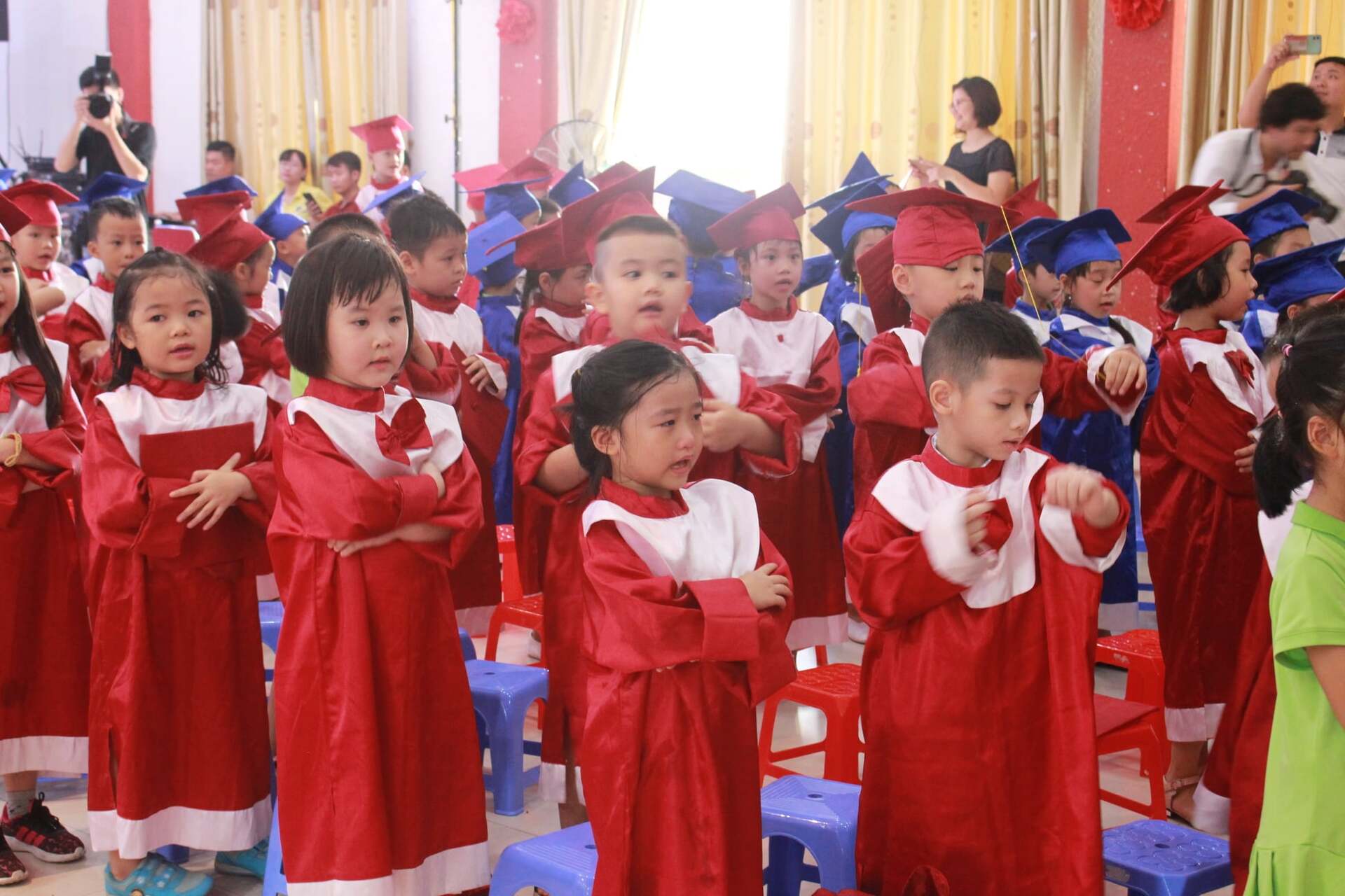 Gương mặt rạng rỡ của các bé khi lên nhận bằng chứng nhận hoàn thành chương trình mẫu giáo. Đại diện Ban Giám hiệu nhà trường và Ban Phụ huynh trực tiếp lên trao bằng, chúc mừng từng bé.