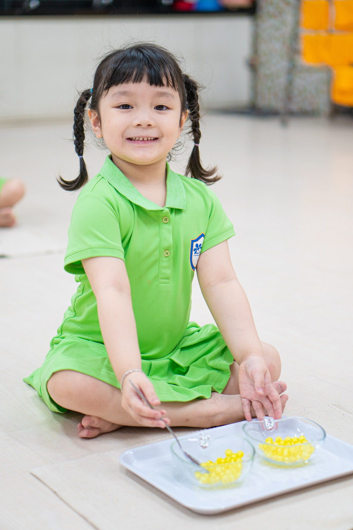 Với vận động tinh, mỗi sự tiến bộ dù nhỏ nhất của các con được cô giáo chú ý trong từng hoạt động. Ở mức độ đơn giản, trẻ học cách cầm nắm đồ vật, đồ chơi. Nâng cao hơn, các cô giáo rèn luyện vận động tinh cho trẻ thông qua những trò chơi: thả đồ chơi, xếp tháp khối, xoay, vặn, lắp ghép từ hạt lớn đến hạt nhỏ… Một ngày nọ, em bé BMSer trở về nhà, tự tin cầm thìa, đóng mở cúc khoá, lật từng trang sách, tự tin sử dụng bút màu vẽ những nét nguệch ngoạc. Cha mẹ hạnh phúc biết bao.