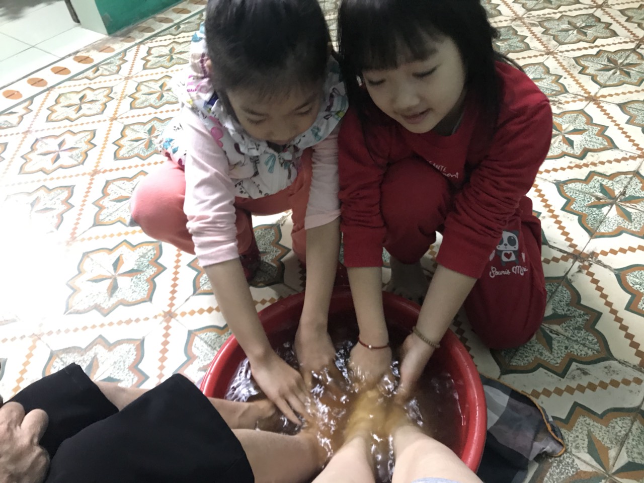 Rửa chân cho ông bà, cha mẹ đã trở thành một hành động ý nghĩa của các bạn nhỏ Ban Mai