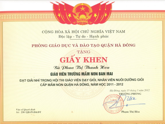 Ngày 15 tháng 3 năm 2012 PGD&ĐT quận Hà Đông long trọng tổ chức Lễ tổng kết Hội thi Giáo viên giỏi- Nhân viên nuôi dưỡng giỏi Quận Hà Đông- Năm học 2011-2012.