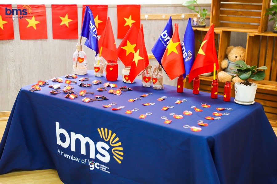 Trong không gian lớp học tại BMS, những mảnh giấy tái chế, vỏ chai nhựa, vải vụn hay chiếc lá khô…đã được “hô biến” thành cờ Tổ quốc, bản đồ Việt Nam rực rỡ, những hình ảnh biểu tượng của thiên nhiên, đất nước. Mặc dù các con còn rất nhỏ nhưng rất hào hứng khi tự tay cắt dán, vẽ hình ảnh quê hương - thể hiện sự tự hào dân tộc, cùng tình yêu và trách nhiệm với môi trường.