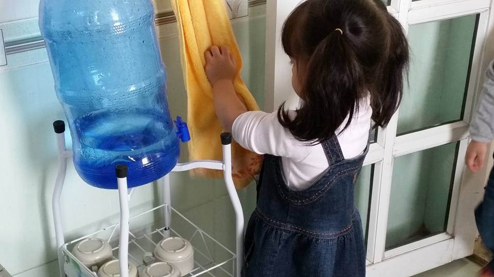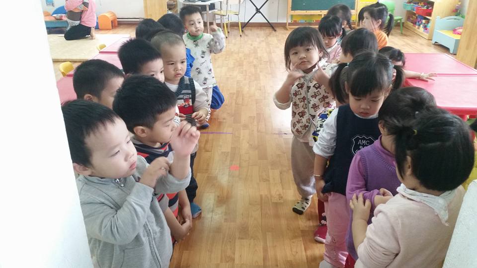 Các con lớp Donald biết xếp hàng lần lượt đi rửa tay