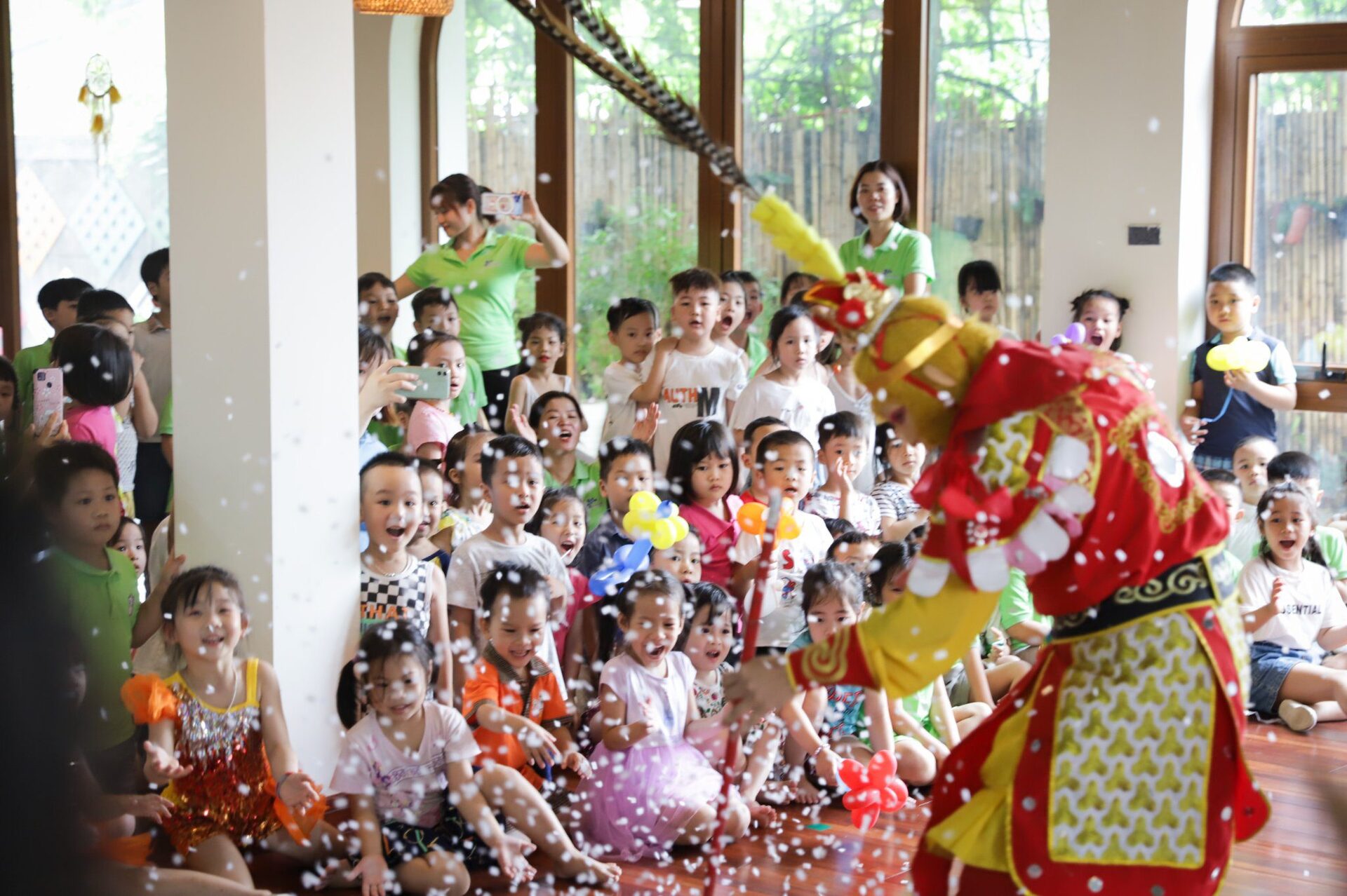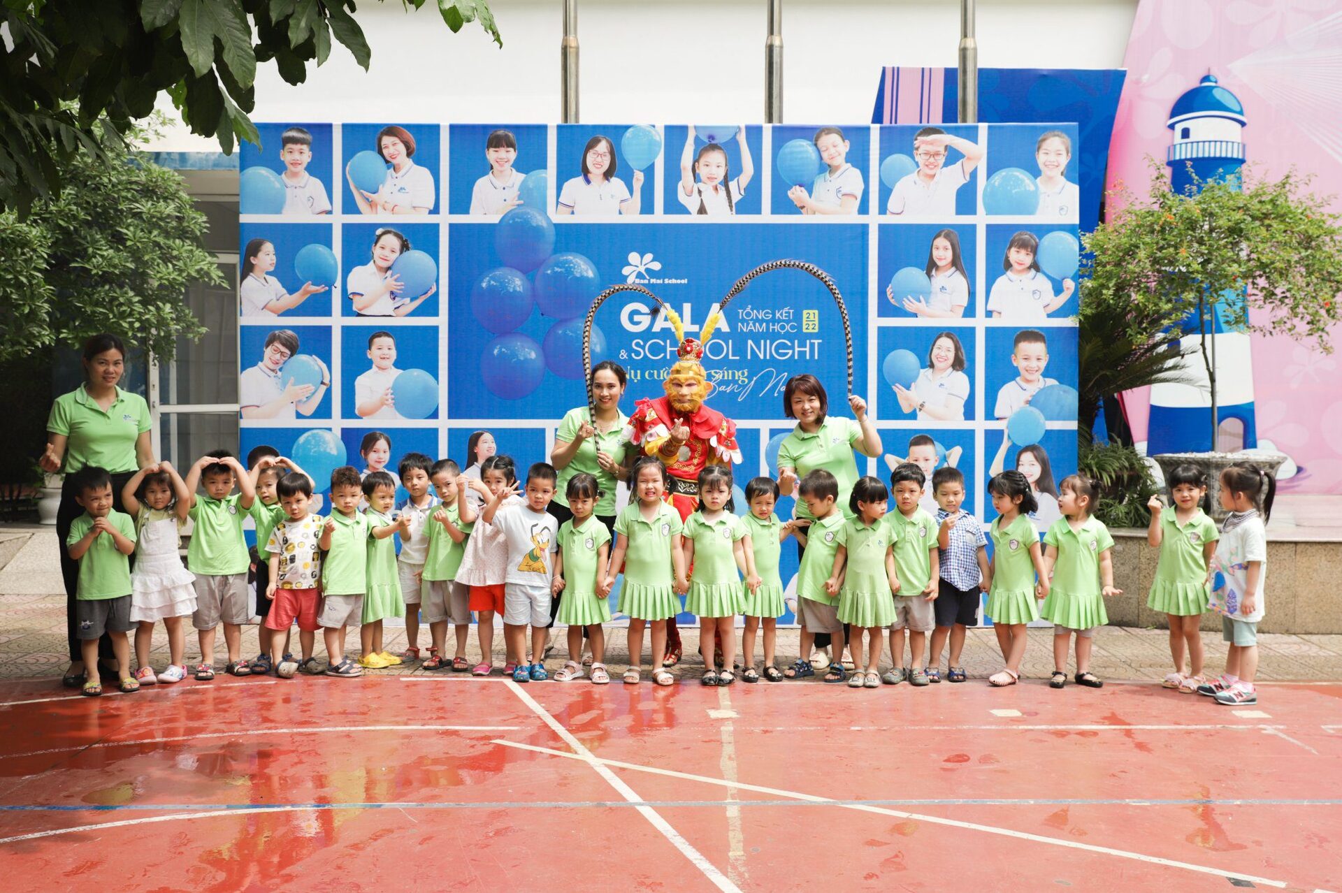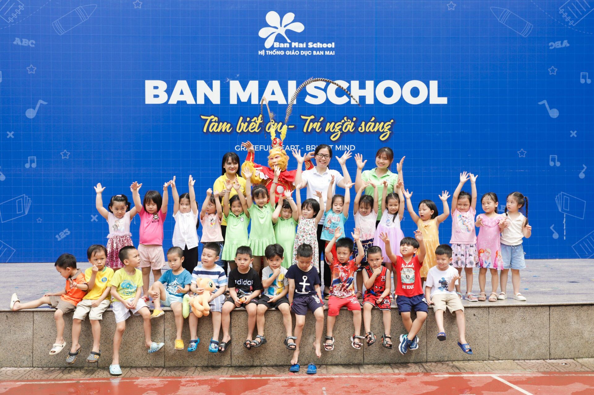 Ở khúc cao trào của chương trình, các con đã có dịp “mắt chữ O, miệng chữ A” trước sự xuất hiện của các Anh Hề, Tôn Ngộ Không và đặc biệt là Chú Khỉ vô cùng đáng yêu, ngộ nghĩnh. Các con không quên níu chân Tề Thiên Đại Thánh để lưu giữ những bức ảnh cùng tập thể lớp mình, những người bạn sẽ cùng các con bước tiếp trên hành trình nuôi dưỡng những em bé hạnh phúc tại Ban Mai.