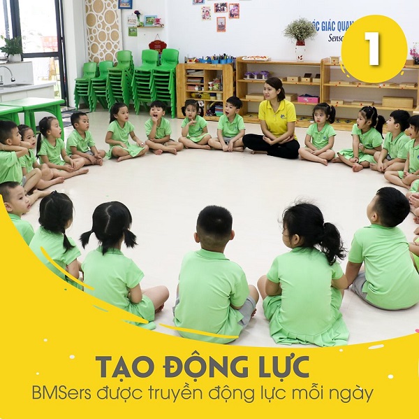 BMSers được truyền động lực hàng ngày, hàng tuần bằng hoạt động “check-in cảm xúc” như: trò chuyện sáng chia sẻ cảm xúc và mục tiêu trong ngày; nuôi dưỡng tình yêu Tổ quốc bằng Lễ chào cờ thiêng liêng hay chăm sóc thể lực, làm mới tâm hồn bằng cách chăm chỉ thể dục mỗi sáng.