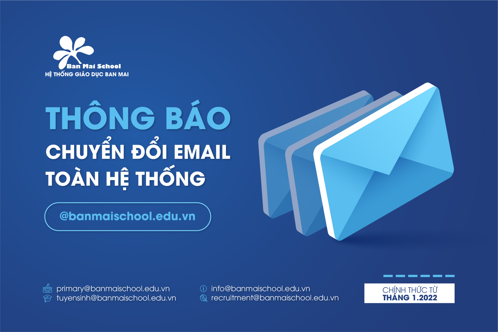 Từ 01/1/2022, Hệ thống Giáo dục Ban Mai chính thức chuyển đổi email từ @banmaischool.com sang @banmaischool.edu.vn.