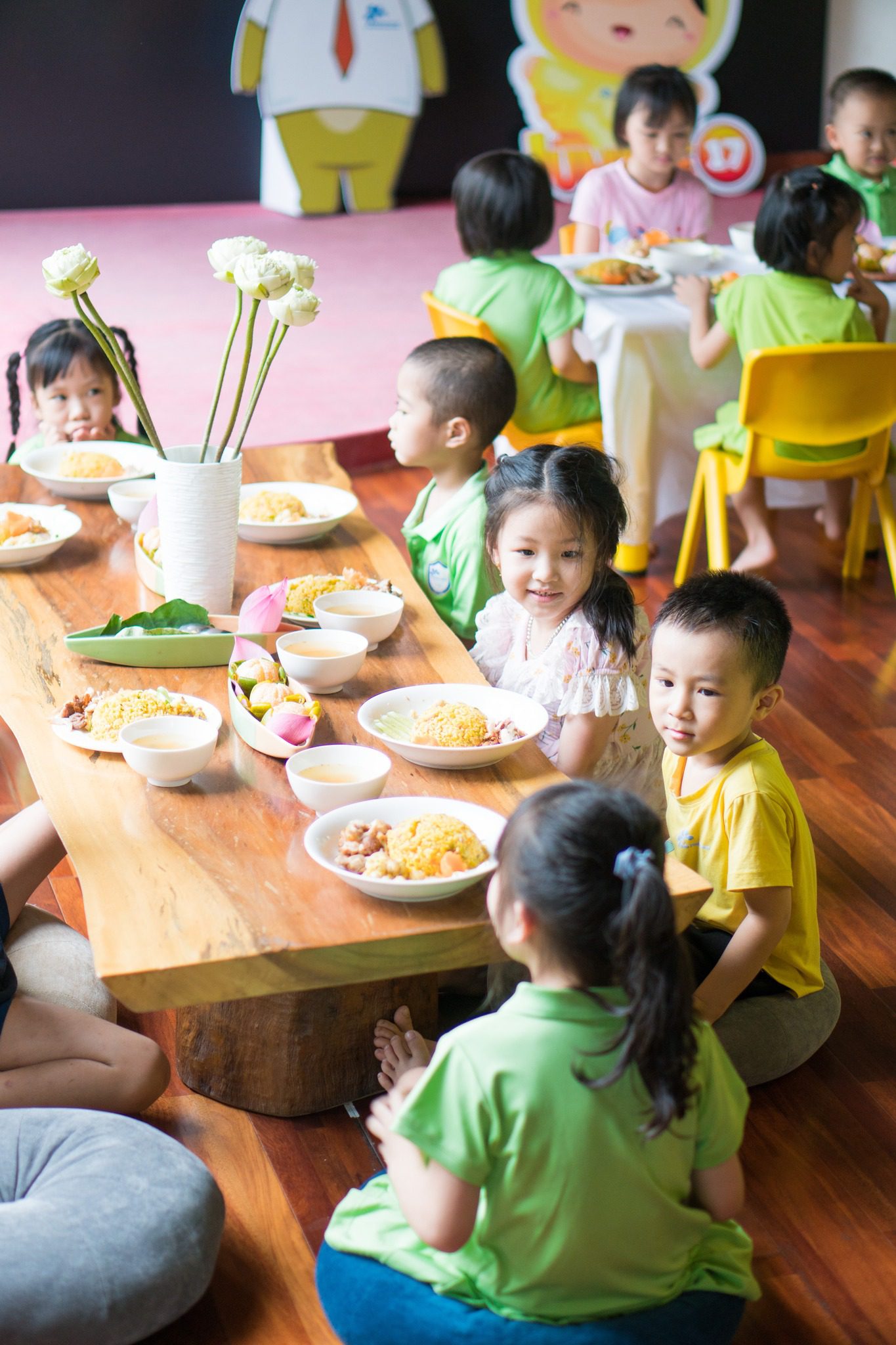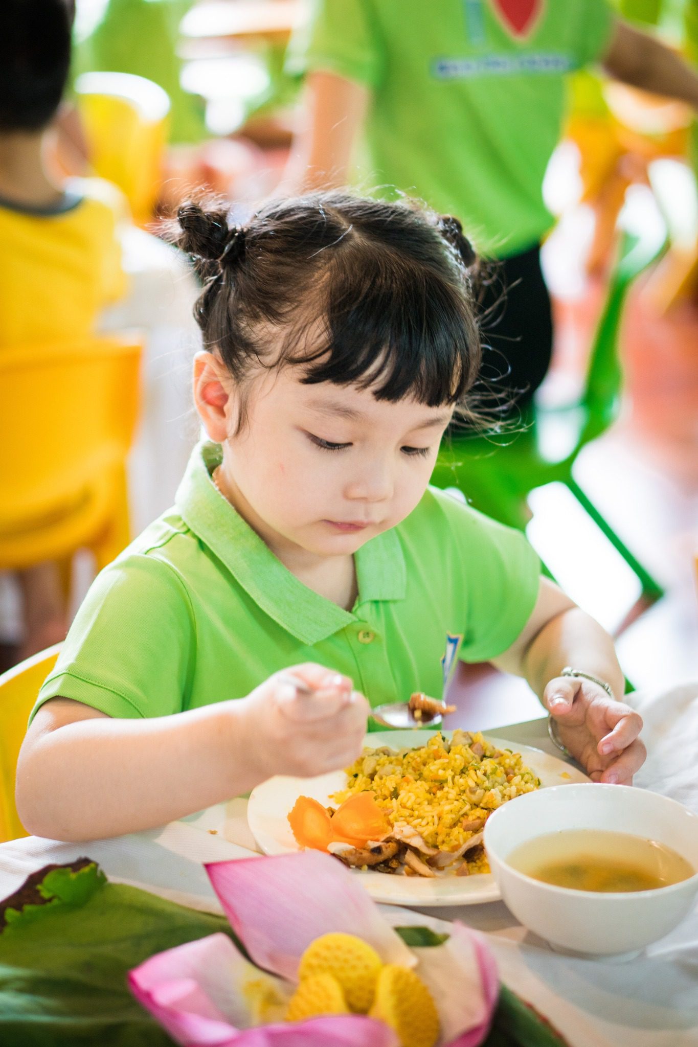 Thực đơn tiệc sen đặc sắc với món Cơm gà hạt sen và Canh ngũ sắc đã mang đến một bữa ăn với đủ chất dinh dưỡng cùng hương vị độc đáo cho các em bé Misa. Đặc biệt, các bạn nhỏ được tự tay sắp xếp bàn ghế, trang trí bàn tiệc, lắng nghe cô giáo giới thiệu về ý nghĩa của Quốc hoa và thành phần của từng món ăn trong bữa tiệc.