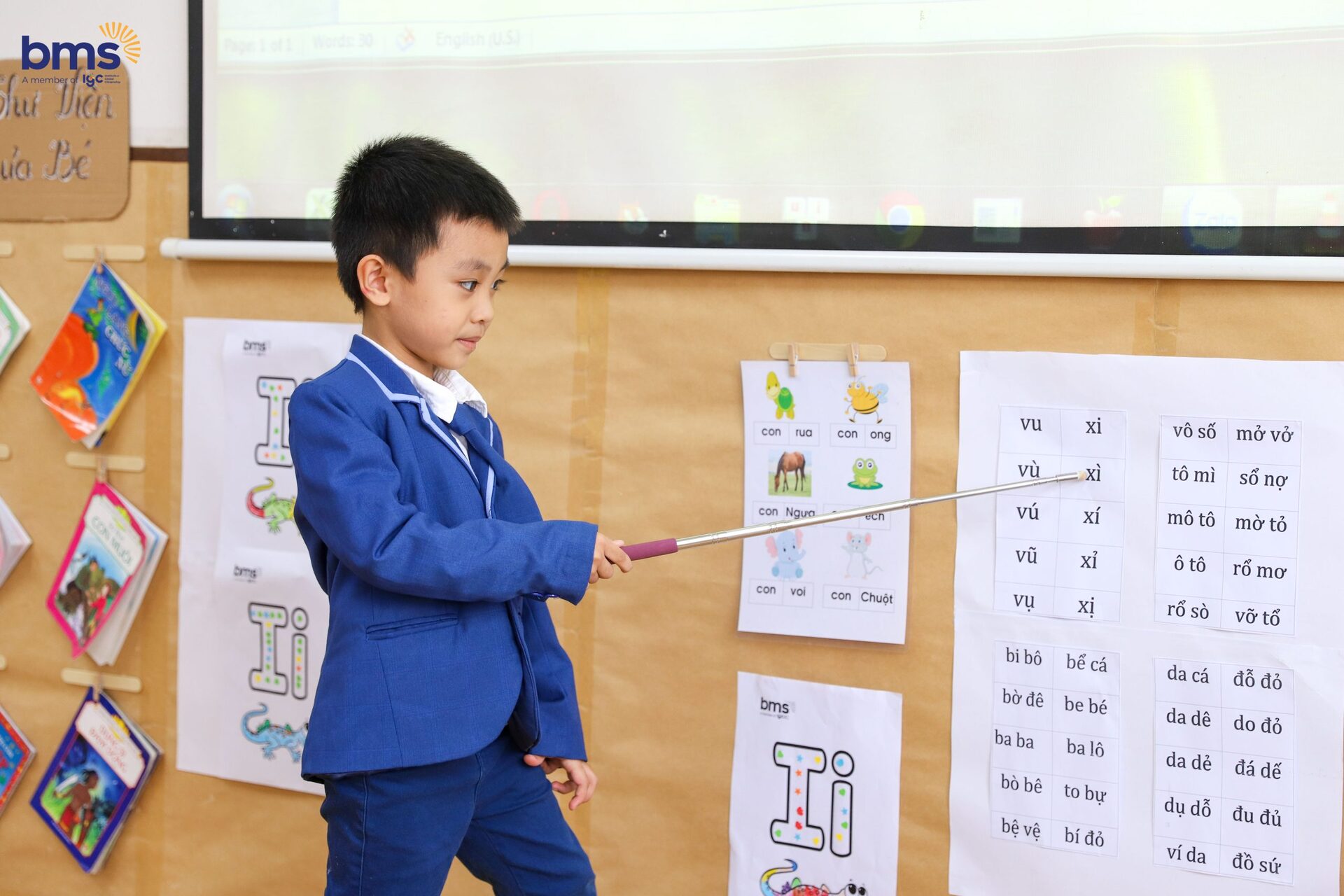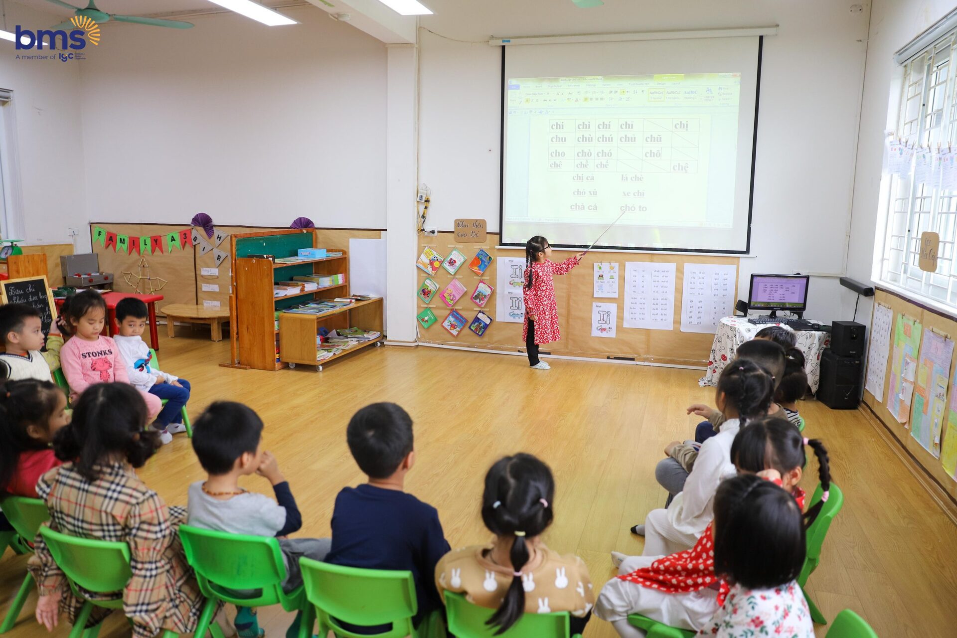 Đứng trên bục giảng, lời nói và biểu cảm của BMSers khác hẳn thường ngày. Từ trang phục đến phong thái đều nghiêm túc và trau chuốt hơn. Các con hình dung được công việc hàng ngày của cô giáo qua những tiết dạy chữ, toán học, montessori,… cùng với đó là sự nhẫn nại, luôn cố gắng và yêu thương các bạn như học trò của mình. Đây cũng là 1 trong những nội dung chính trong mục tiêu giáo dục tại BMS.