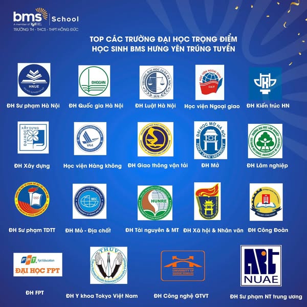Điều đáng trân trọng là các em không chỉ bước qua cánh cửa đại học mà còn khẳng định bản lĩnh và khát vọng khi ghi danh vào nhiều trường uy tín hàng đầu cả nước. Từ các lĩnh vực Giáo dục, Ngoại giao, Y khoa, Kinh tế, Xây dựng, Công nghệ cho đến Thể thao và Nghệ thuật, học sinh BMS Hưng Yên đã cho thấy sự đa dạng trong lựa chọn ngành nghề cũng như sự tự tin theo đuổi ước mơ.