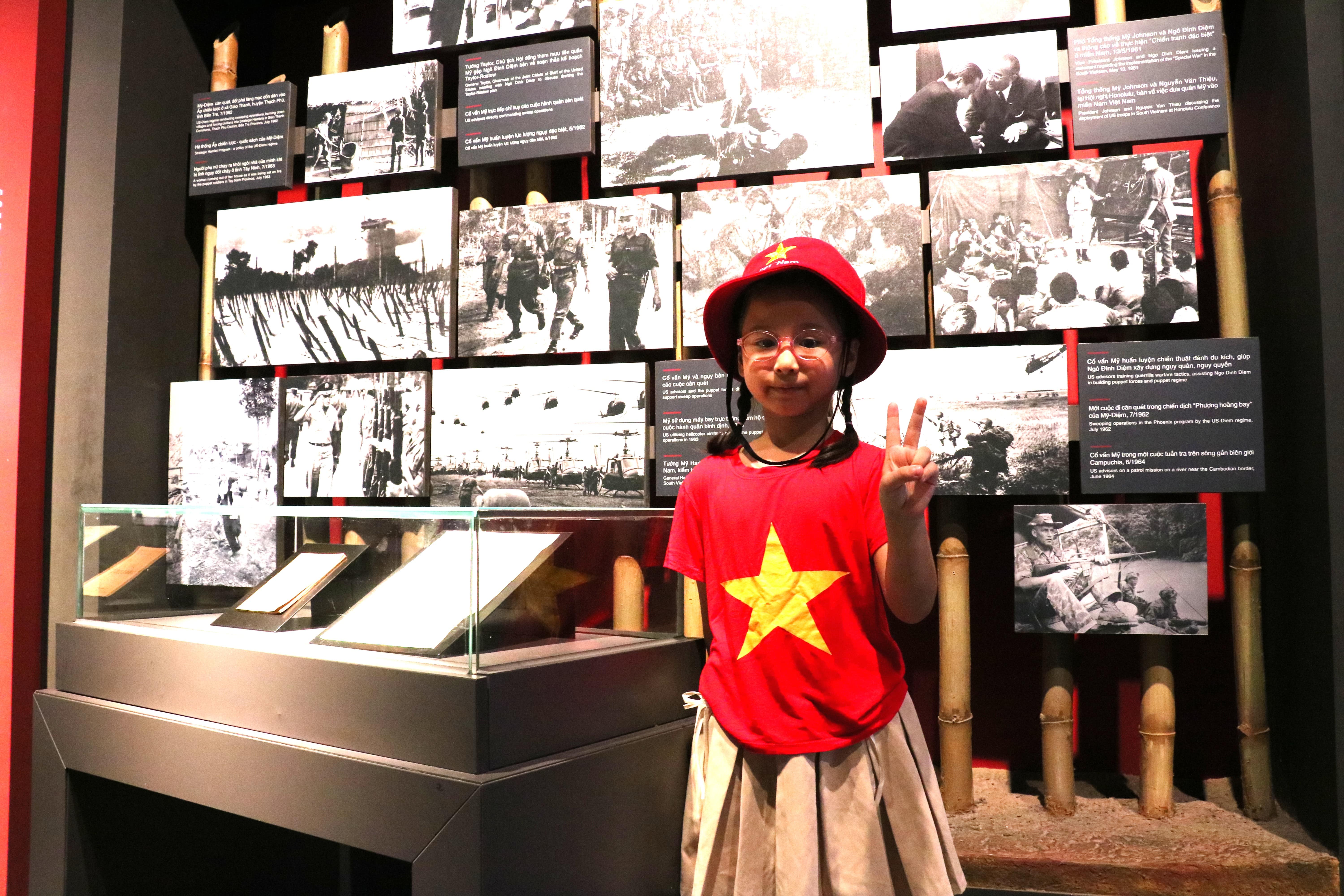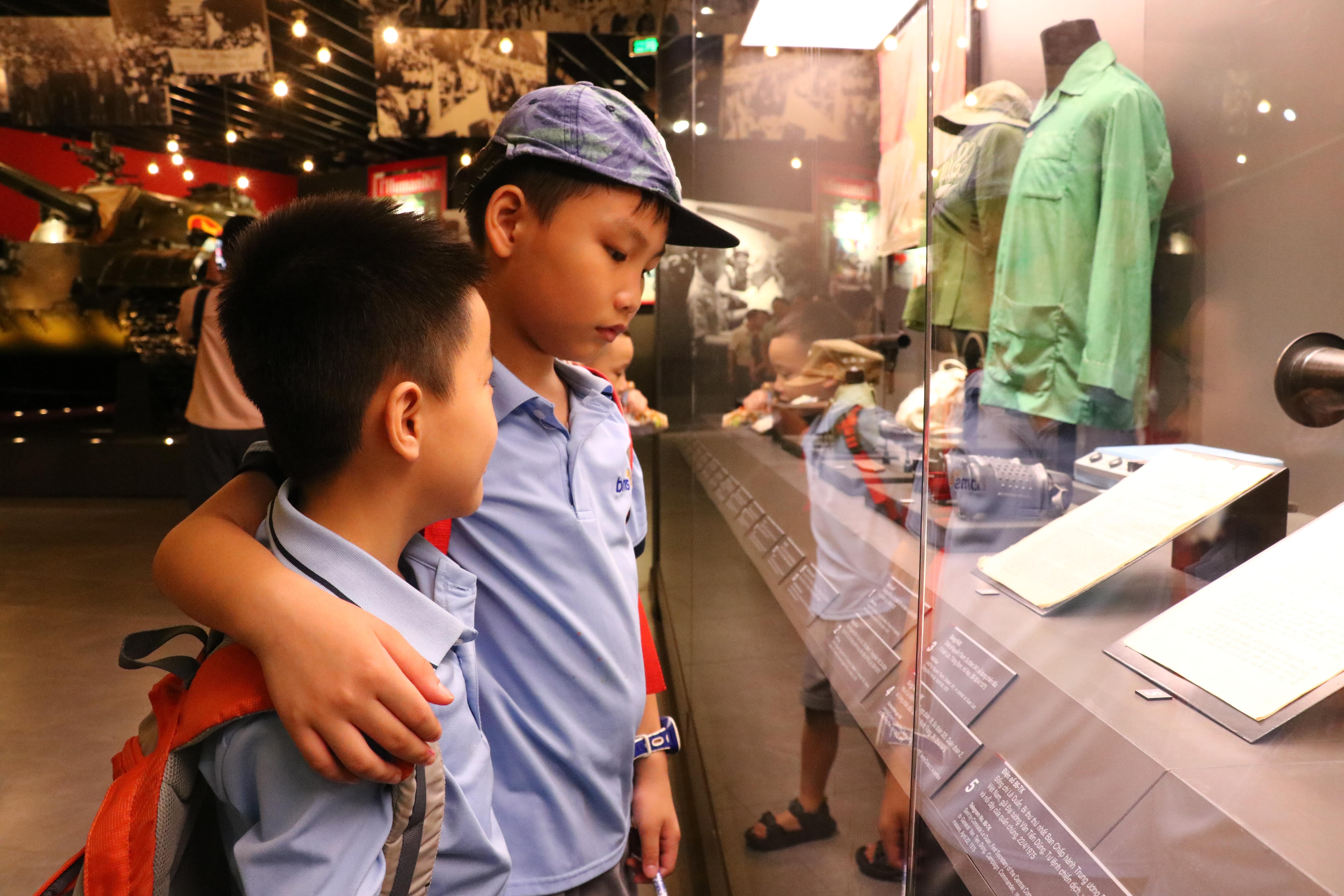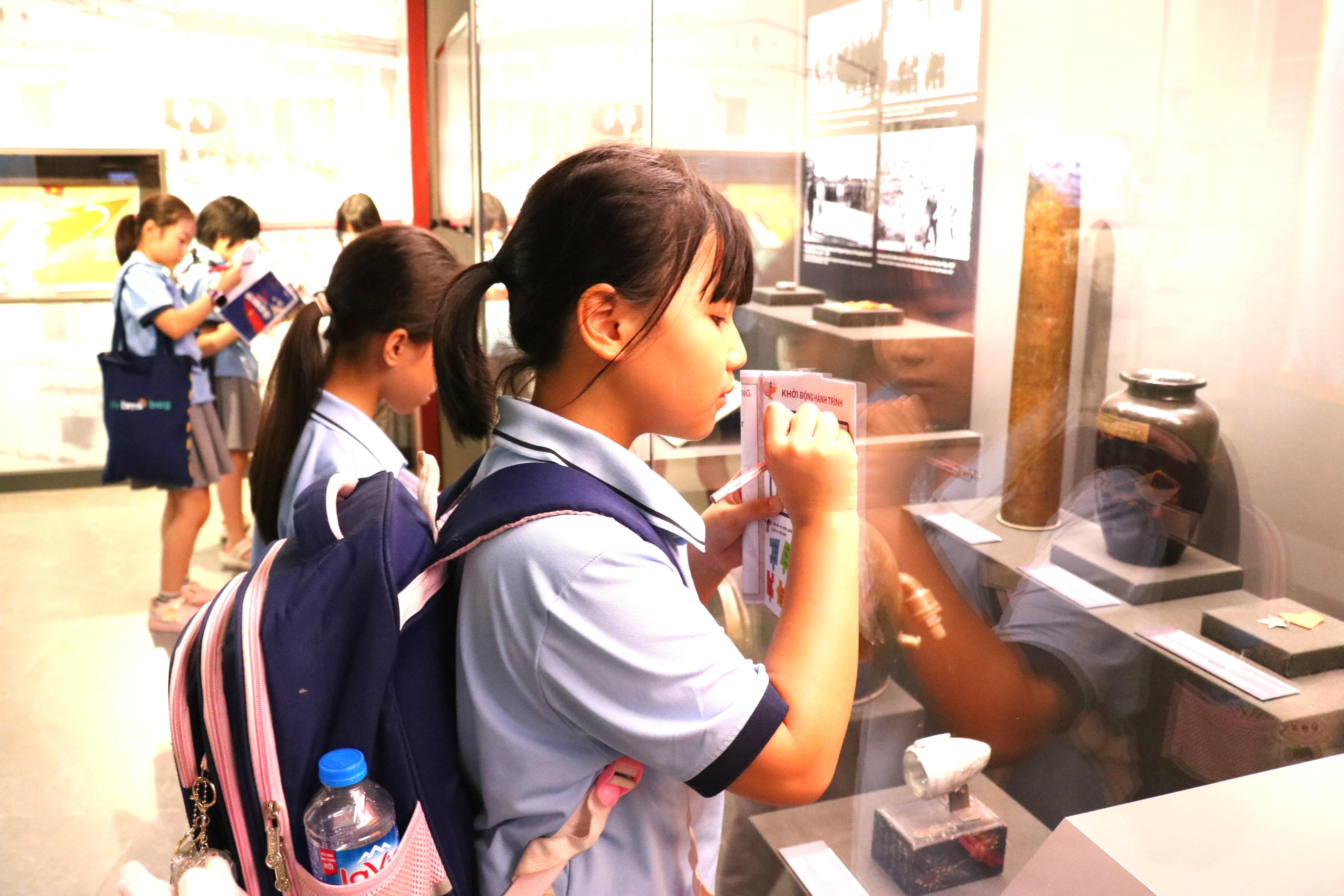 Các em say mê quan sát từng chi tiết, chăm chú ghi chép những thông tin thú vị, rồi cùng nhau trao đổi, chia sẻ cảm nhận. Có bạn reo lên khi thấy lá cờ đỏ sao vàng tung bay trong bức ảnh ngày chiến thắng, có bạn lại lặng yên thật lâu trước tủ kính trưng bày đôi dép cao su và chiếc mũ sắt – những vật dụng đã gắn liền với hình ảnh người chiến sĩ năm xưa.