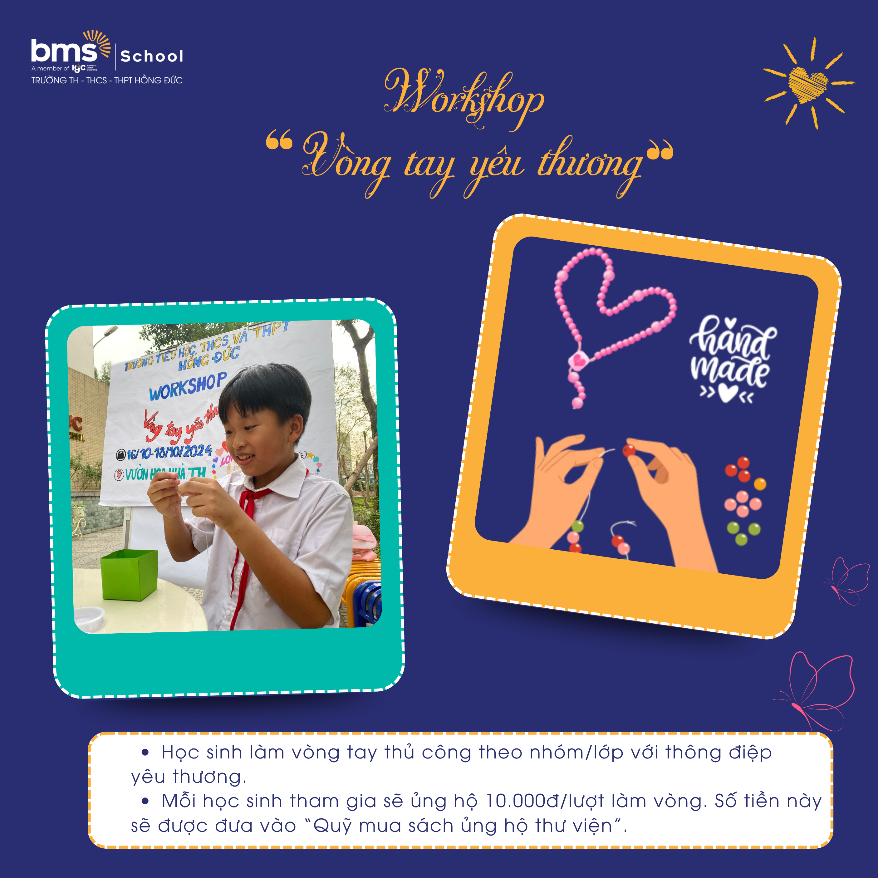 Không chỉ dừng lại ở ngôn từ, BMSers còn được trải nghiệm sự gắn kết qua Workshop “Vòng tay yêu thương”. Tại đây, học sinh cùng nhau làm những chiếc vòng tay thủ công theo nhóm, theo lớp.
