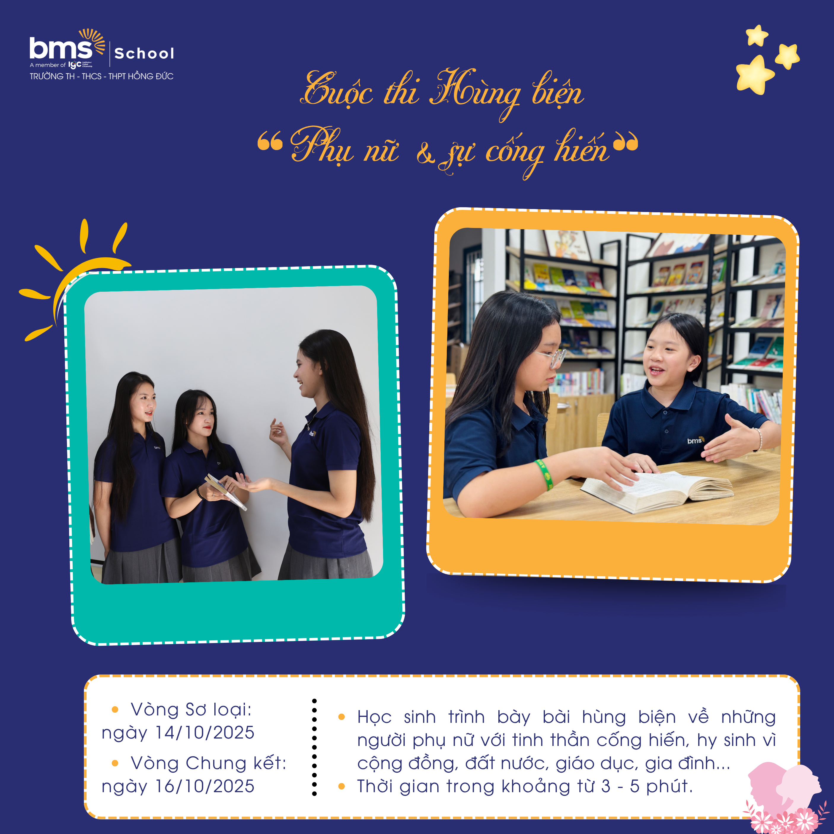 Nếu cuộc thi viết và workshop giúp các em thể hiện tình cảm qua chữ viết và hành động, thì cuộc thi hùng biện “Phụ nữ & sự cống hiến” lại là nơi các BMSers tự tin cất lên tiếng nói của mình. Trong 3–5 phút thuyết trình, học sinh được chia sẻ suy nghĩ về vai trò của người phụ nữ trong gia đình, giáo dục, cộng đồng và đất nước.