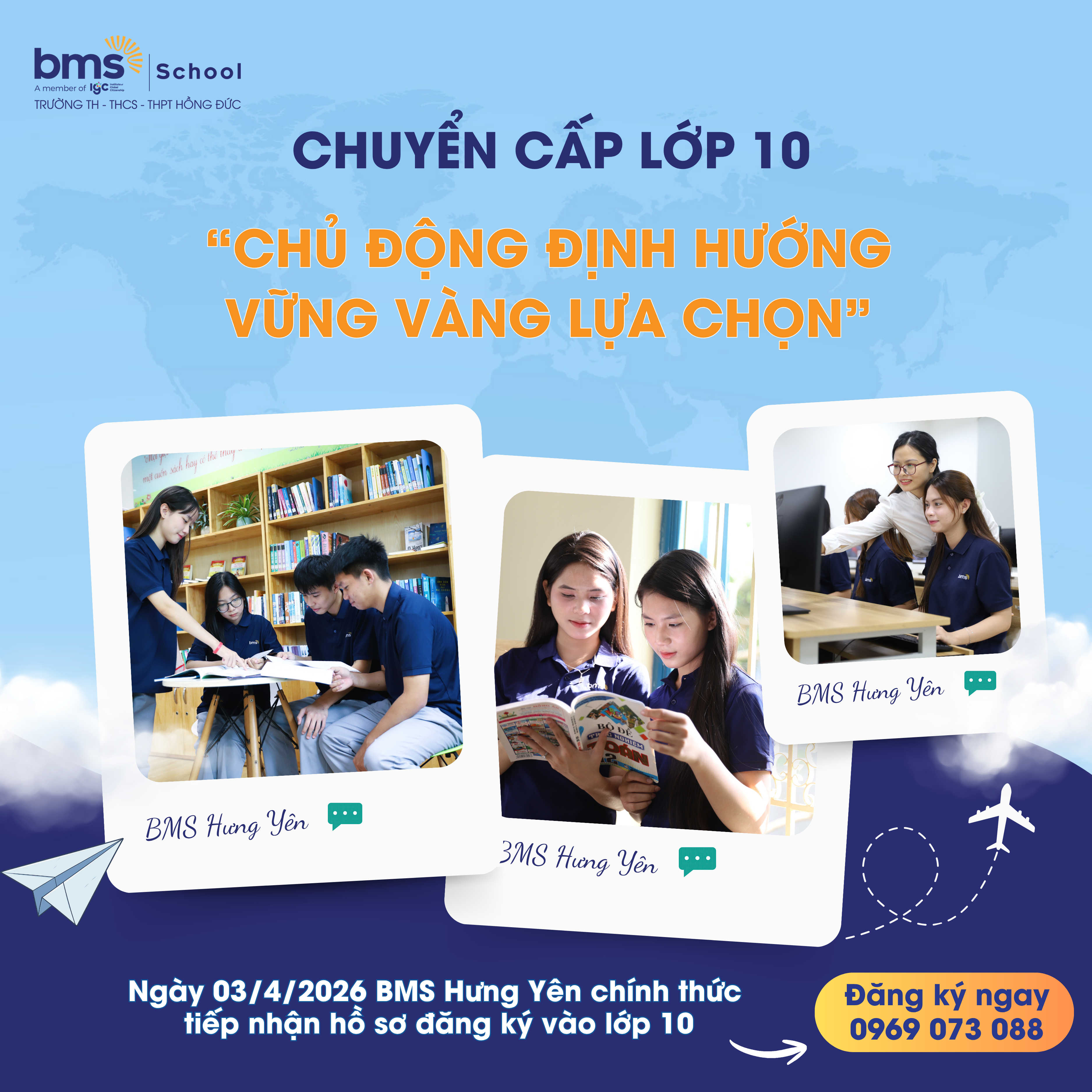 Từ ngày 03/4/2026, BMS Hưng Yên (Trường Tiểu học, THCS và THPT Hồng Đức) chính thức tiếp nhận hồ sơ đăng ký vào lớp 10 năm học 2026–2027. Đây là thời điểm phù hợp để phụ huynh và học sinh tìm hiểu thông tin tuyển sinh, lựa chọn môi trường học tập và chuẩn bị kế hoạch cho chặng đường phía trước.