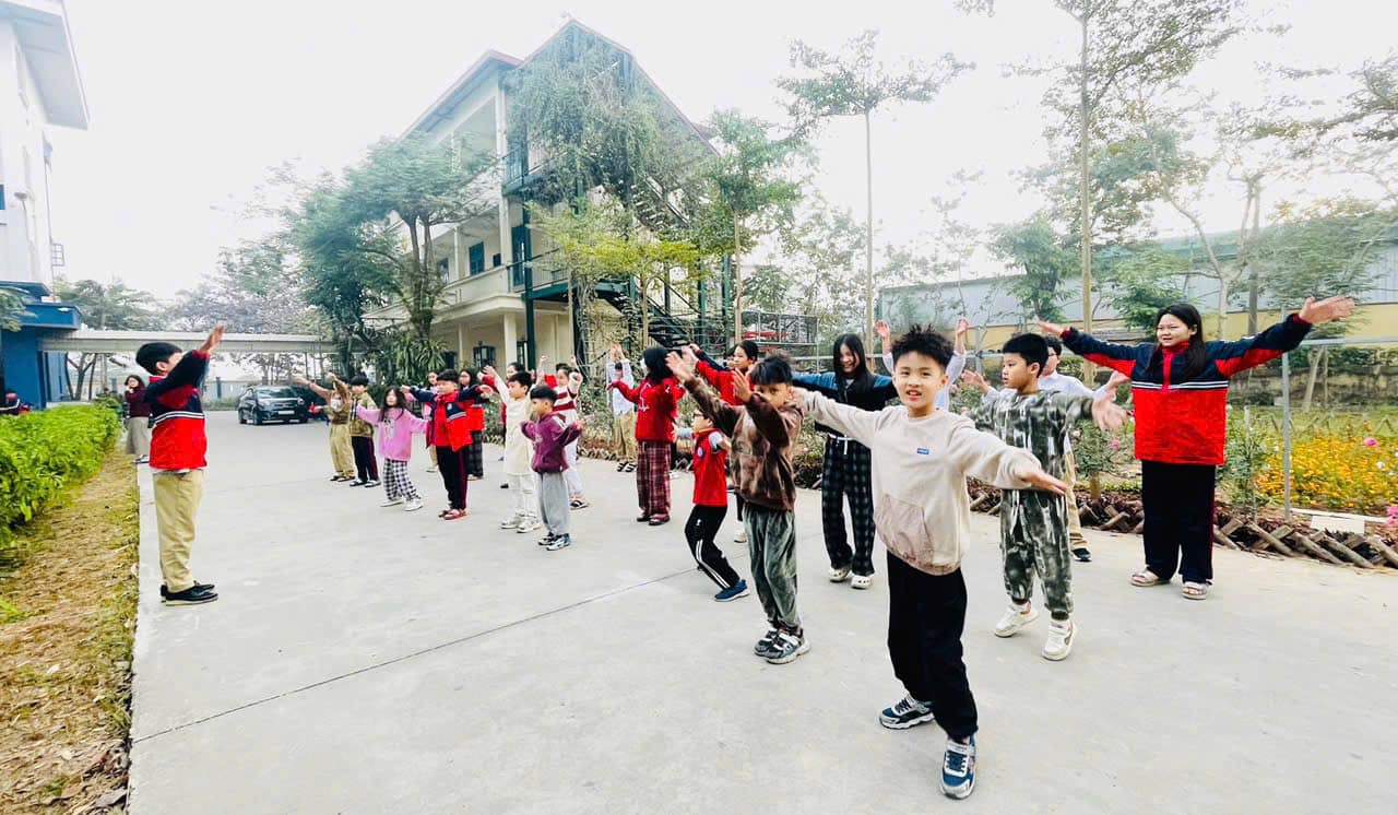 Tiếp theo, đó là cùng nhau tập thể dục buổi sáng - thói quen tốt giúp các em nâng cao sức khỏe, cải thiện thể chất và khởi động năng lượng cho một ngày hoạt động đầy hứng khởi.