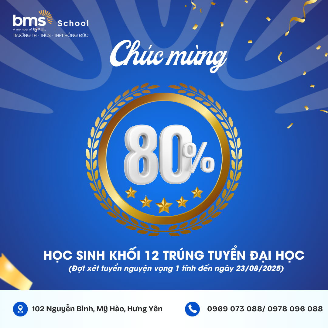 Năm học 2024 – 2025 đánh dấu một cột mốc quan trọng trong hành trình trưởng thành của học sinh khối 12 BMS Hưng Yên. Với kết quả hơn 80% em trúng tuyển ngay từ đợt xét tuyển đầu tiên, thế hệ học sinh cuối cấp đã chứng minh năng lực học tập vững vàng cùng tinh thần cầu tiến.