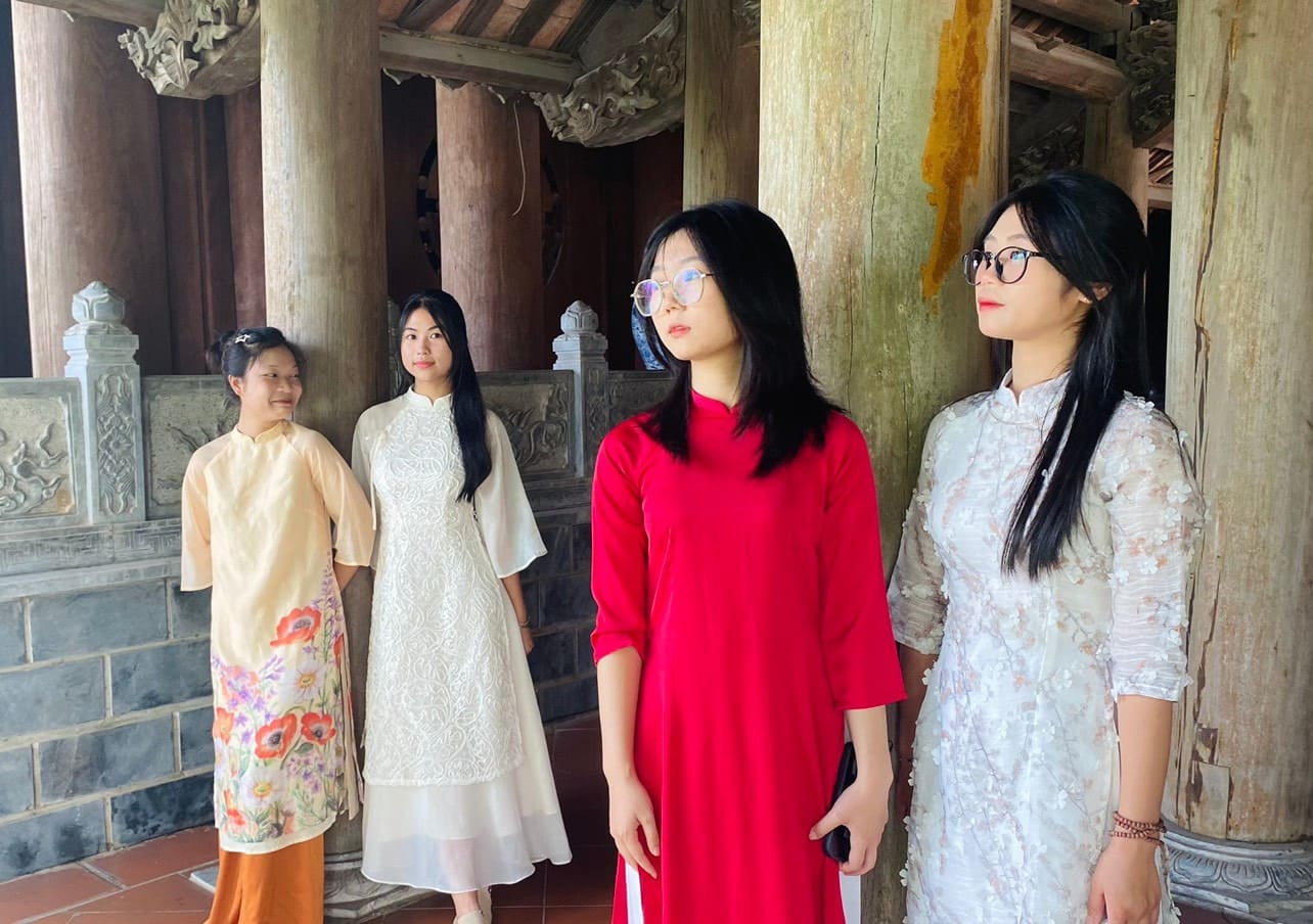 Thấp thoáng áo dài truyền thống của nữ sinh bên cạnh những cột gỗ với kiến trúc độc đáo trong chùa Nôm