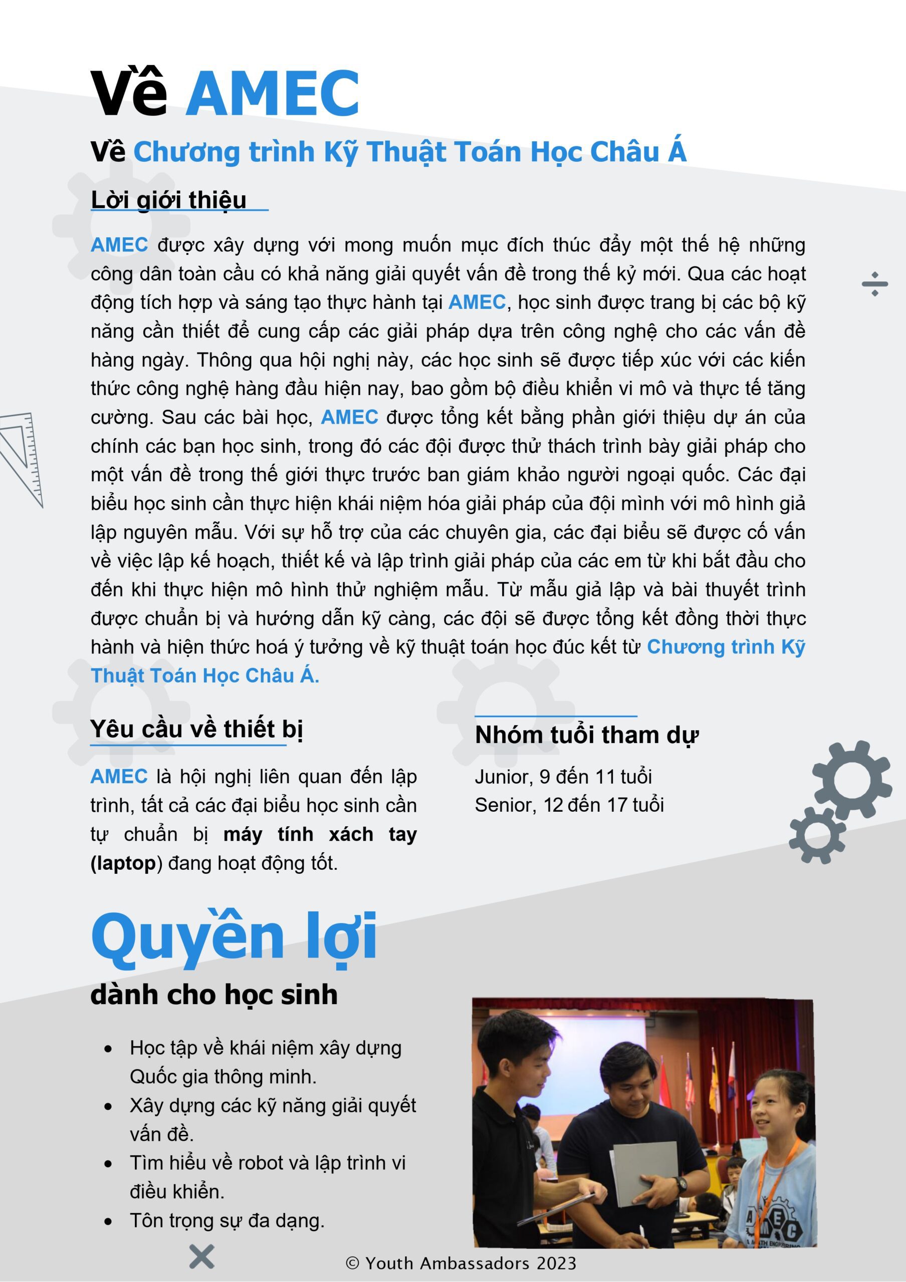 AMEC là hội nghị liên quan đến lập trình, tất cả các đại biểu học sinh cần tự chuẩn bị máy tính xách tay (laptop) đang hoạt động tốt.
