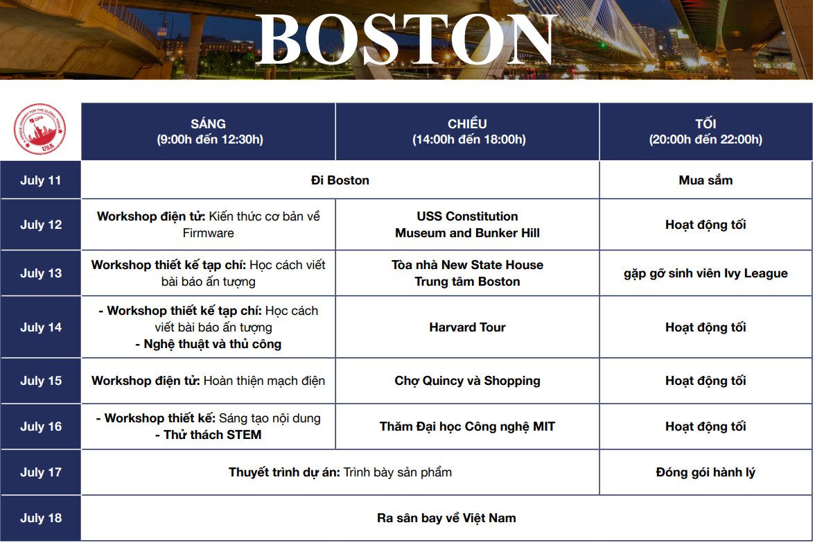Đây sẽ là hành trình đáng nhớ với những chuyến đi tới các địa danh nổi tiếng thế giới tại New York và Boston, tham dự các lớp học tương tác với giáo viên và nhân sự người bản xứ, học và thực hành nhiều kỹ năng quan trọng giúp các em trưởng thành, khám phá giới hạn bản thân, tạo động lực học tập tự chủ và có định hướng tương lai.