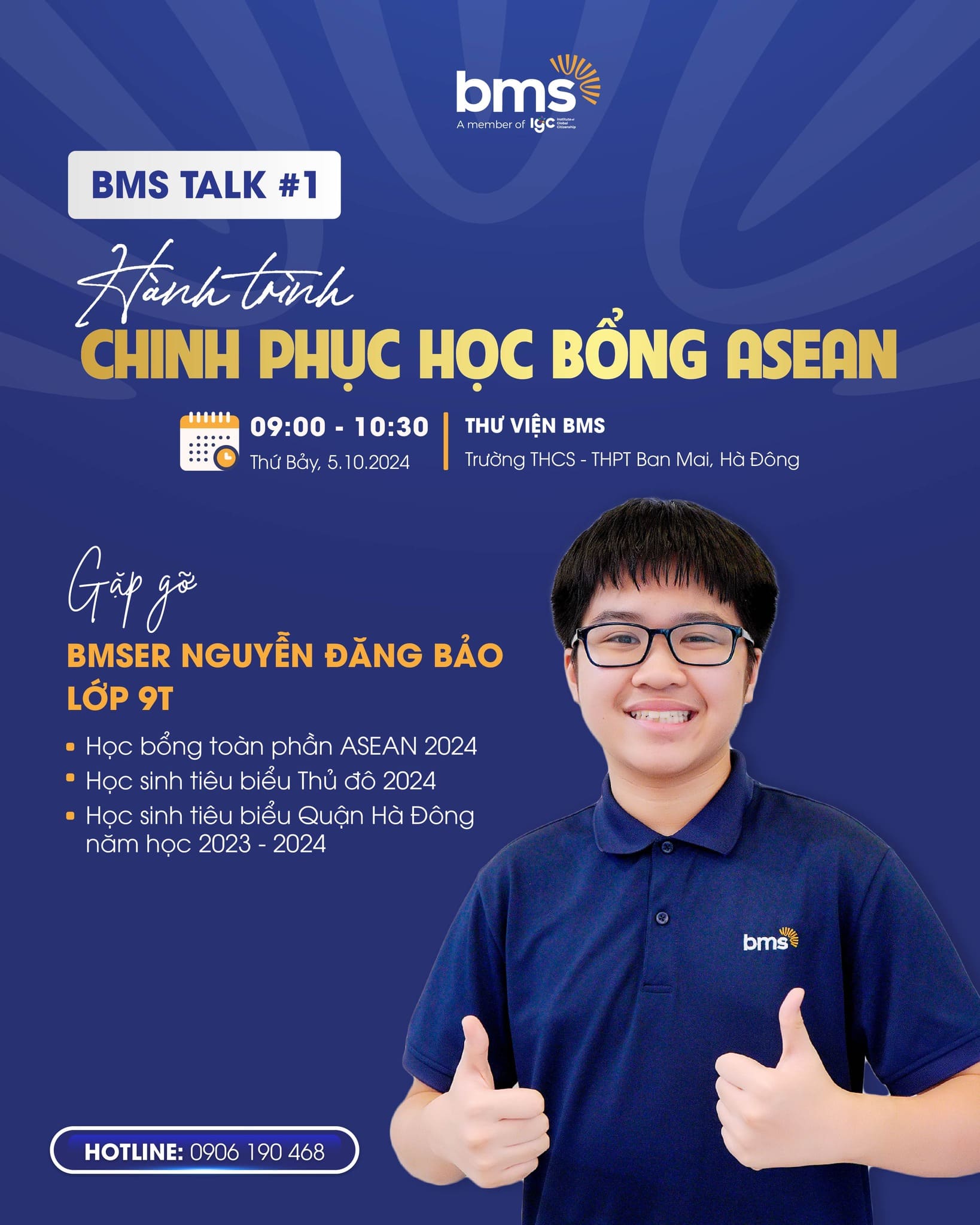 Trước ngày lên đường đi du học, Đăng Bảo sẽ dành thời gian gặp gỡ, truyền cảm hứng tới Quý Cha mẹ và các em học sinh tại BMS Talk #1 với chủ đề: "Hành trình chinh phục học bổng ASEAN” cùng Mẹ Phạm Lan Anh, cô giáo chủ nhiệm Hoàng Thị Lộc, là những người đã đồng hành quan trọng, sẽ chia sẻ bí quyết và trải nghiệm quý báu trong hành trình đạt học bổng toàn phần ASEAN 2024: