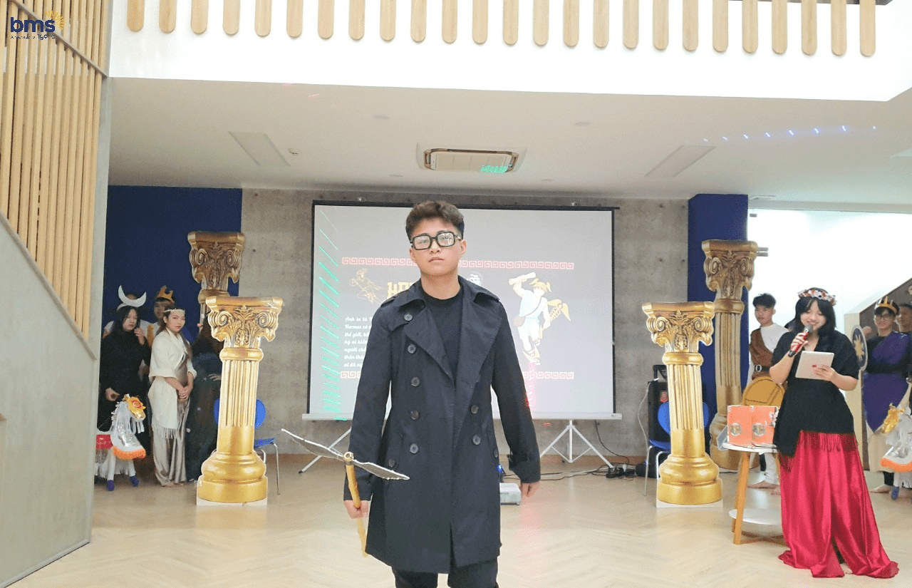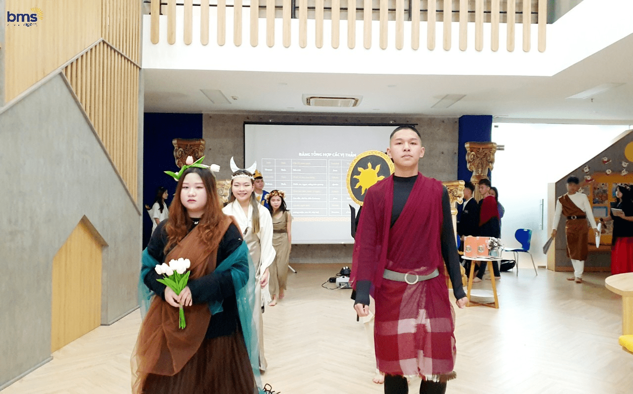 Không chỉ có sự chuẩn bị kỹ lưỡng về trang phục mà các bạn học sinh lớp 12S còn mô phỏng chi tiết về tính cách của các vị thần thông qua hành động, biểu cảm khuôn mặt và cách trình diễn trên sân khấu. Các bạn thực sự đã hóa thân trọn vẹn để trở thành những vị thần đầy quyền năng trong thần thoại Hy Lạp.