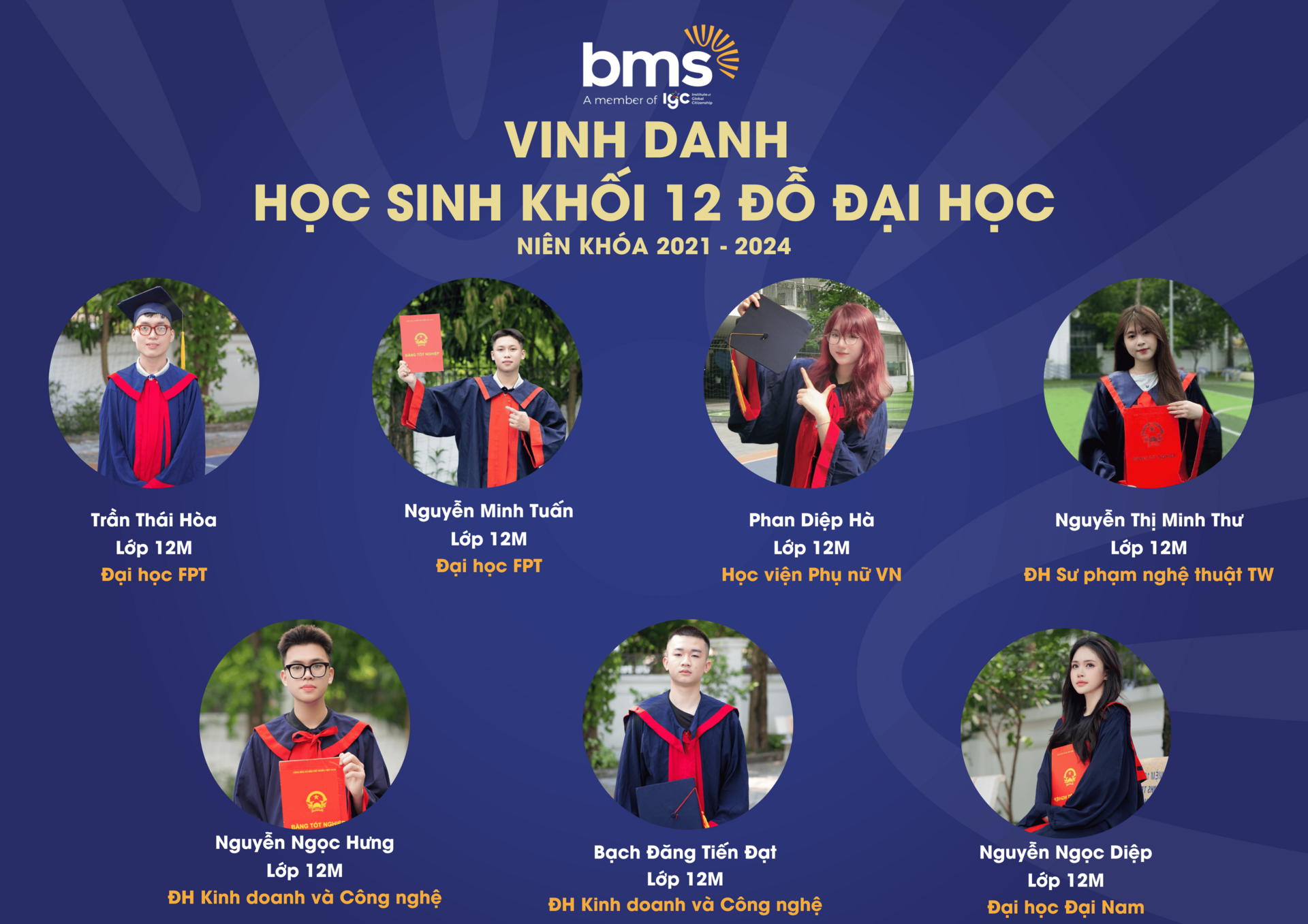 Thầy cô tự hào vinh danh thành tích xuất sắc của 100% học sinh Khối 12 (niên khóa 2021 – 2024) đã gặt hái những trái ngọt mang tên “Đỗ Đại học” trên hành trình giáo dục đầy khát vọng và kiên định của BMS.Với sự đồng hành tận tâm từ đội ngũ giáo viên, cùng phương pháp giảng dạy hiện đại, kết hợp giữa kiến thức và kỹ năng thực tiễn, BMS đã tạo nên một môi trường học tập - nơi mỗi học sinh được khơi dậy đam mê và định hướng tương lai. Thành tích 100% học sinh đỗ tốt nghiệp THPT và chinh phục bảng vàng Đại học là minh chứng cho chất lượng giáo dục vượt trội mà BMS mang đến cho mỗi thế hệ học sinh.