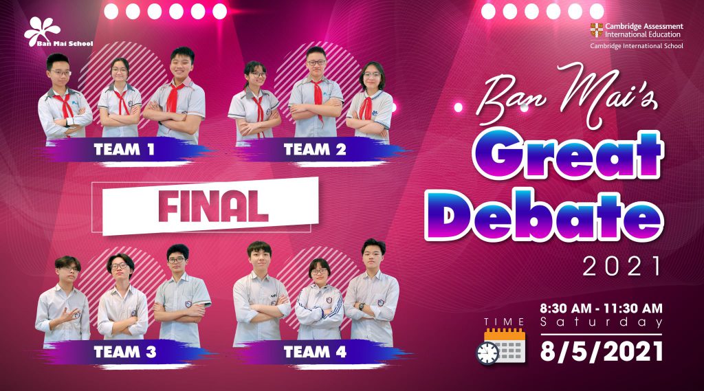 “BAN MAI’S GREAT DEBATE 2021” là game show đầy trí tuệ, đầy cạnh tranh, mang tính học thuật cao, đồng thời trên sàn đấu tranh biện các BMSers được phát triển khả năng tư duy phản biện, làm việc nhóm, và lan tỏa tinh thần của trường quốc tế Cambridge.