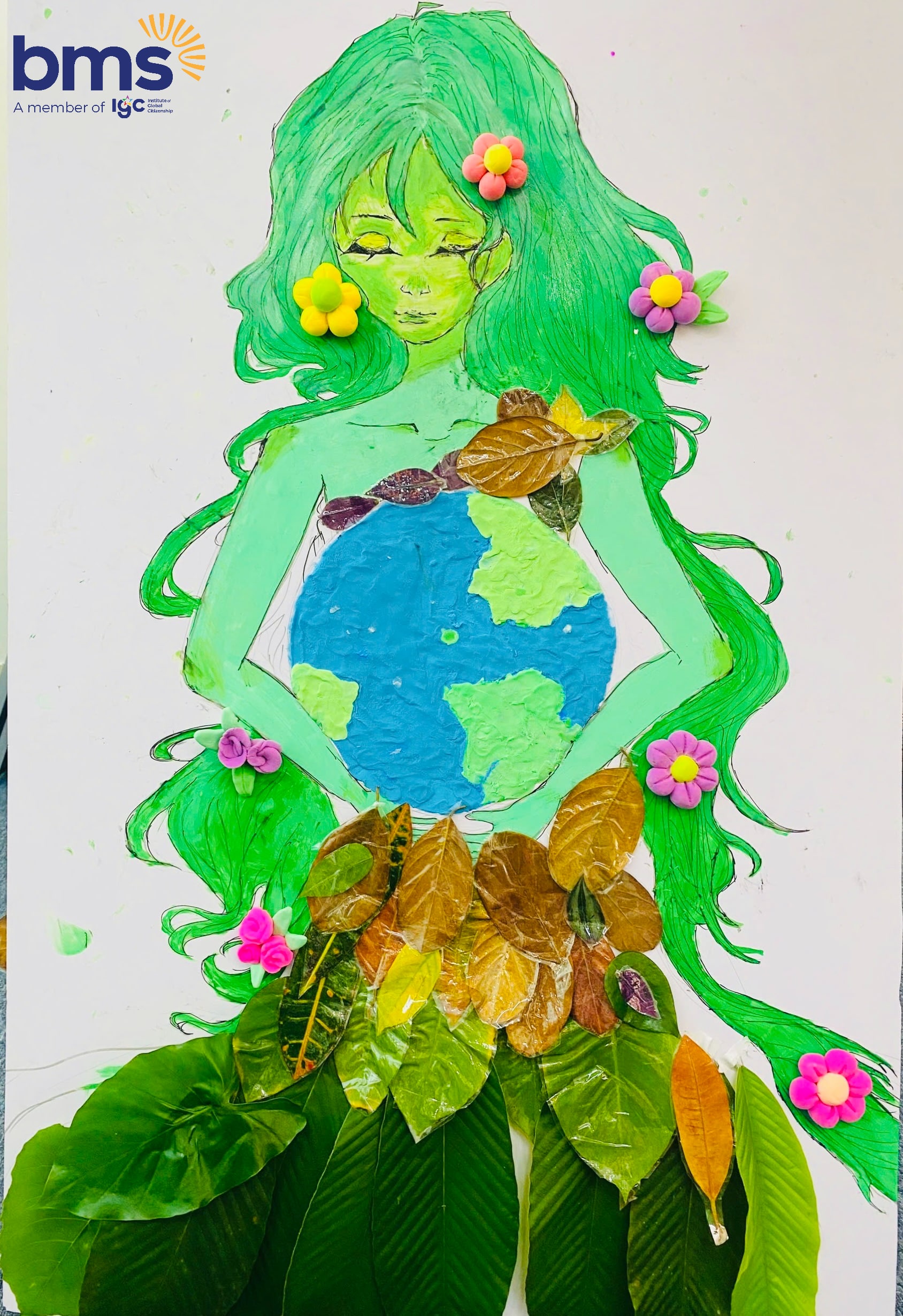 Tác phẩm chung "Mẹ Thiên Nhiên": Tác phẩm từ nguyên liệu thiên nhiên, tái hiện hình ảnh Mẹ Thiên Nhiên ôm lấy Trái Đất, biểu tượng cho sự bảo vệ và nuôi dưỡng. Những chiếc lá đại diện cho sự đa dạng sinh học, gửi gắm thông điệp về việc bảo vệ môi trường và trách nhiệm cá nhân trong sử dụng tài nguyên bền vững.