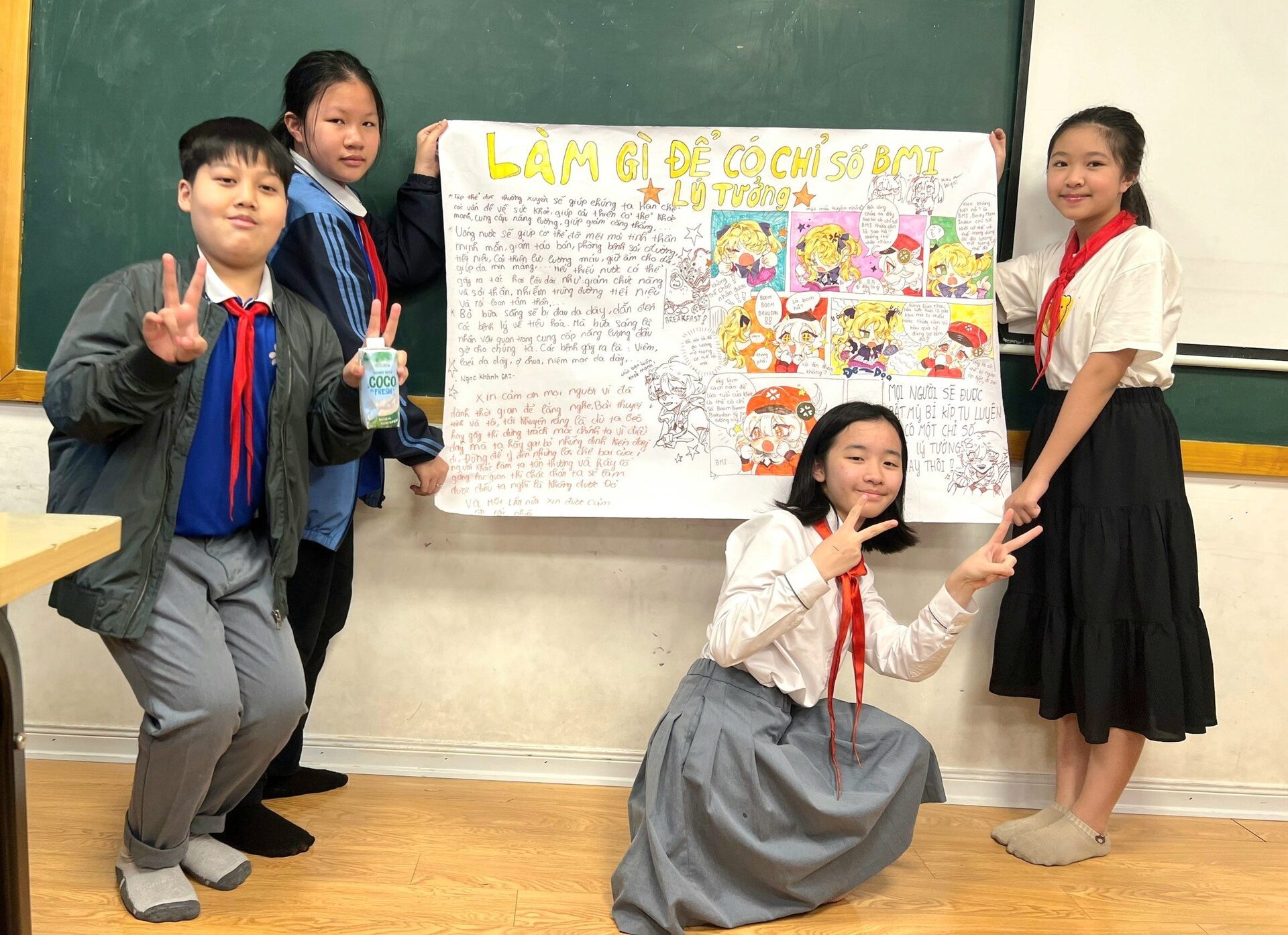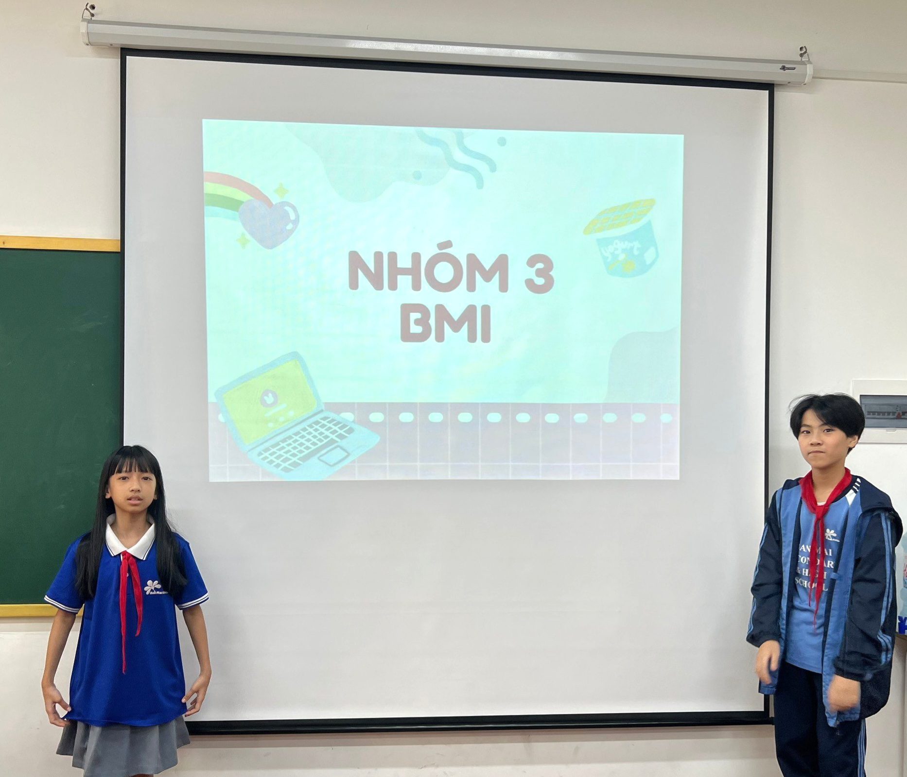 Các học sinh thực hành đo chỉ số BMI và báo cáo sản phẩm cấp Trường