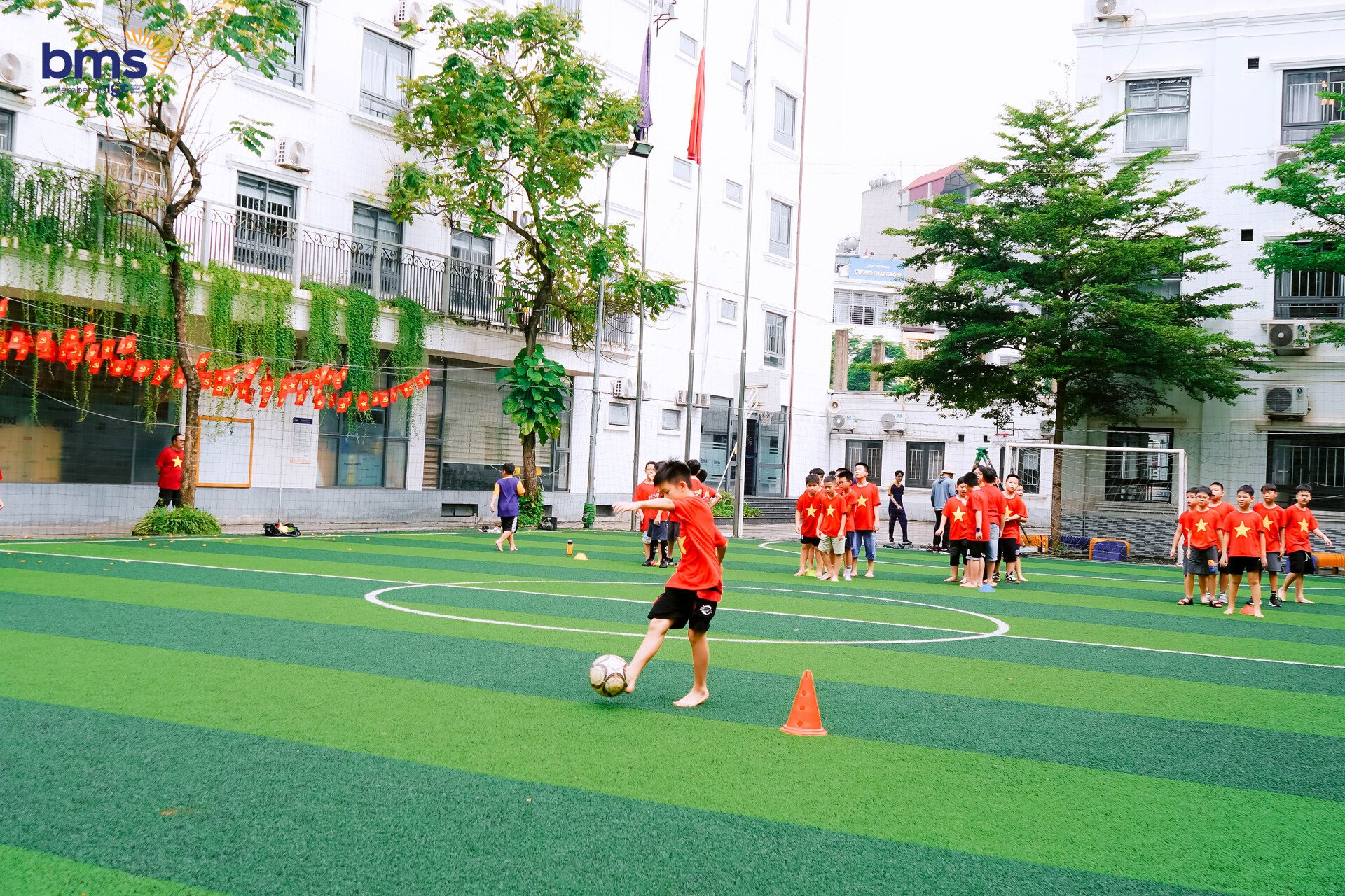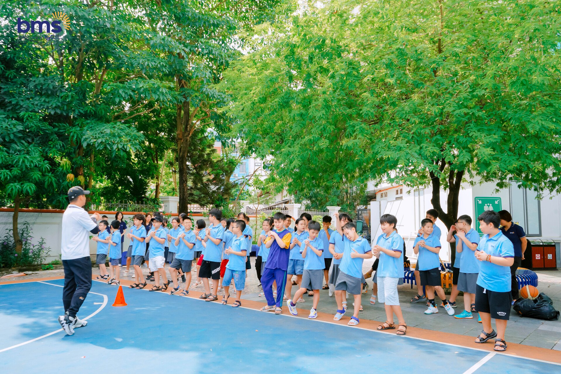 Ngay sau đó, các bạn ra sân tập luyện thể chất với bộ môn bóng đá và bóng rổ. Dưới sự hướng dẫn tận tình của giáo viên, BMSers khối 5 đã thử sức, phối hợp ăn ý trong từng pha di chuyển và cổ vũ nhau hết mình. Tiếng reo hò, những bước chạy nhanh nhẹn và nụ cười rạng rỡ lan tỏa khắp sân trường khiến buổi trải nghiệm càng thêm sôi động và hào hứng.