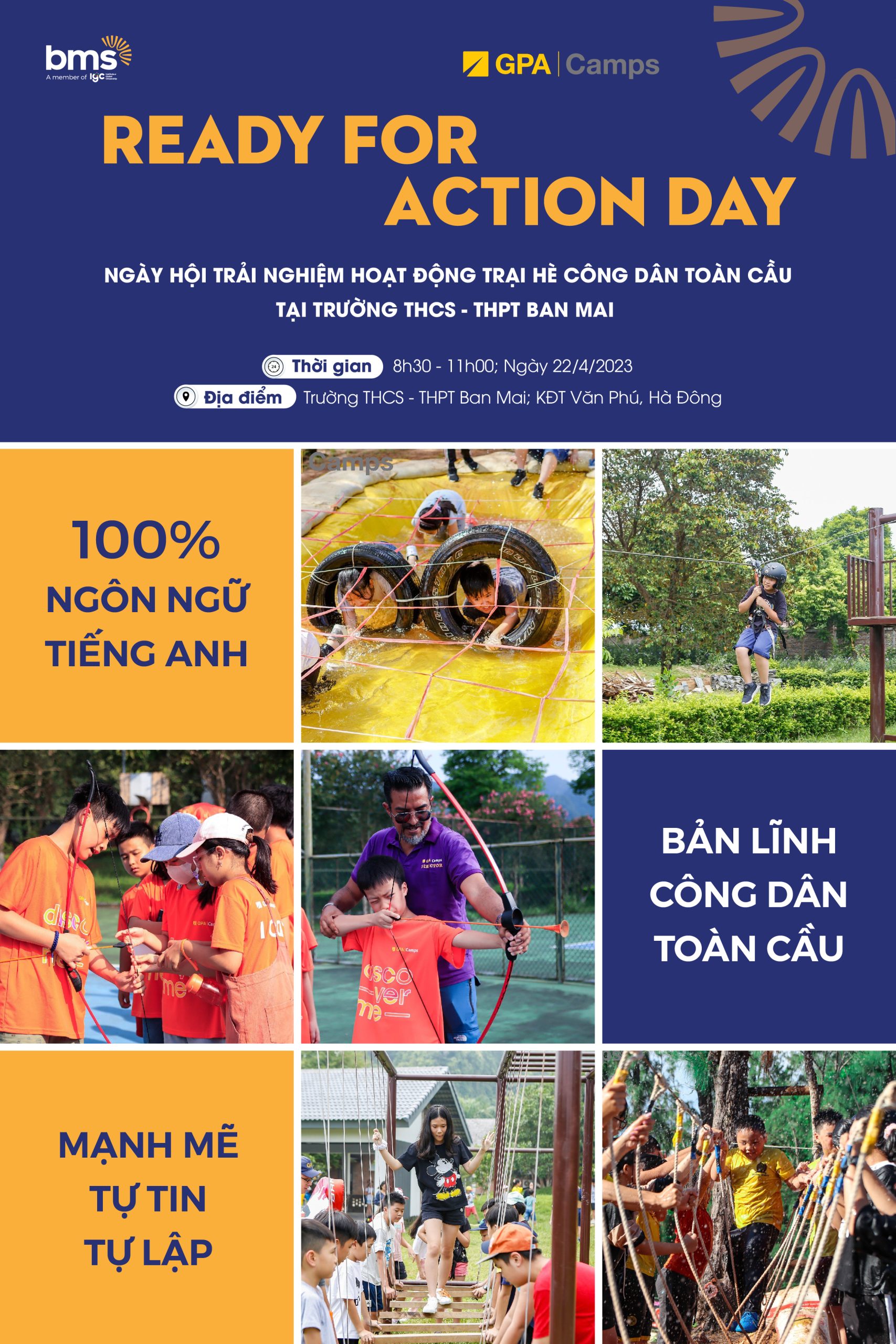 Tại ngày hội trải nghiệm và kết nối “Ready for Action Day”, các học sinh sẽ tham gia một số trò chơi và hoạt động tương tự các hoạt động diễn ra trong chương trình trại hè Future Me. Trong khi đó, Cha mẹ sẽ tham gia Talkshow tìm hiểu về những lợi ích của trại hè trong quá trình giáo dục các con, thông qua tương tác với các chuyên gia GPA Camps cũng như trực tiếp trải nghiệm các hoạt động cùng con trong trại hè mô phỏng.