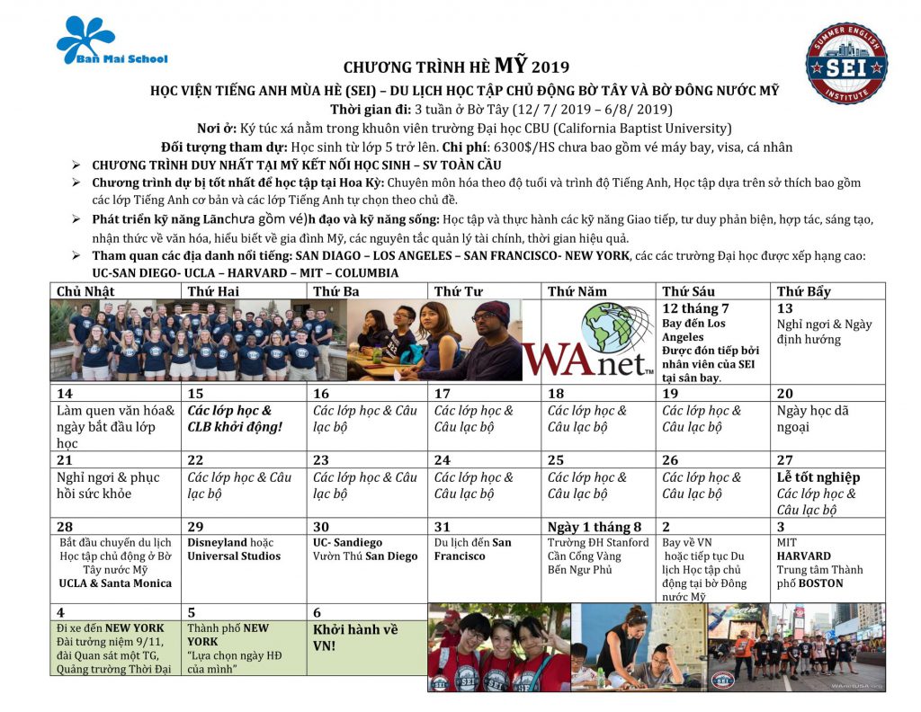 Để mở rộng cơ hội học tập, trải nghiệm cho nhiều đối tượng học sinh Ban Mai hè 2019, nhà trường xây dựng chương trình Hè Quốc tế đa dạng, đồng bộ với nhiều chương trình học tập trải nghiệm, thú vị và hiệu quả. Chương trình là cơ hội để các em nâng cao trình độ ngoại ngữ, mở rộng tầm nhìn, trau dồi kỹ năng sống, làm quen với các nền giáo dục tiên tiến thế giới, hòa nhập vào môi trường toàn cầu và chuẩn bị cho hành trang du học, vào đời trong thời đại công nghệ 4.0.