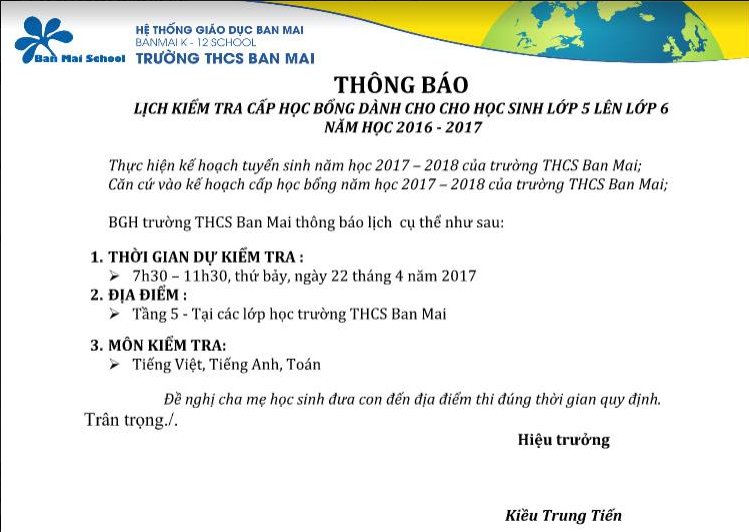 THÔNG BÁO LỊCH THI CẤP HỌC BỔNG NHÂN TÀI THCS BAN MAI