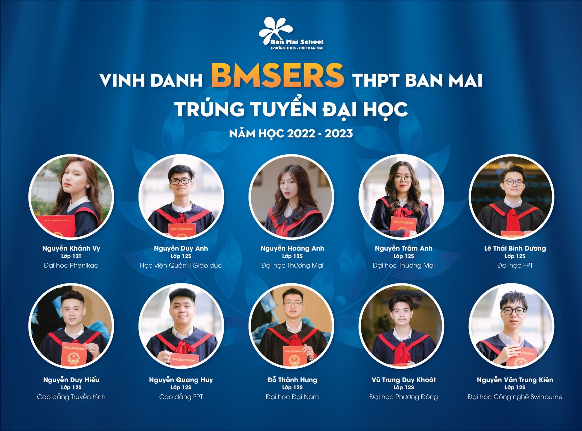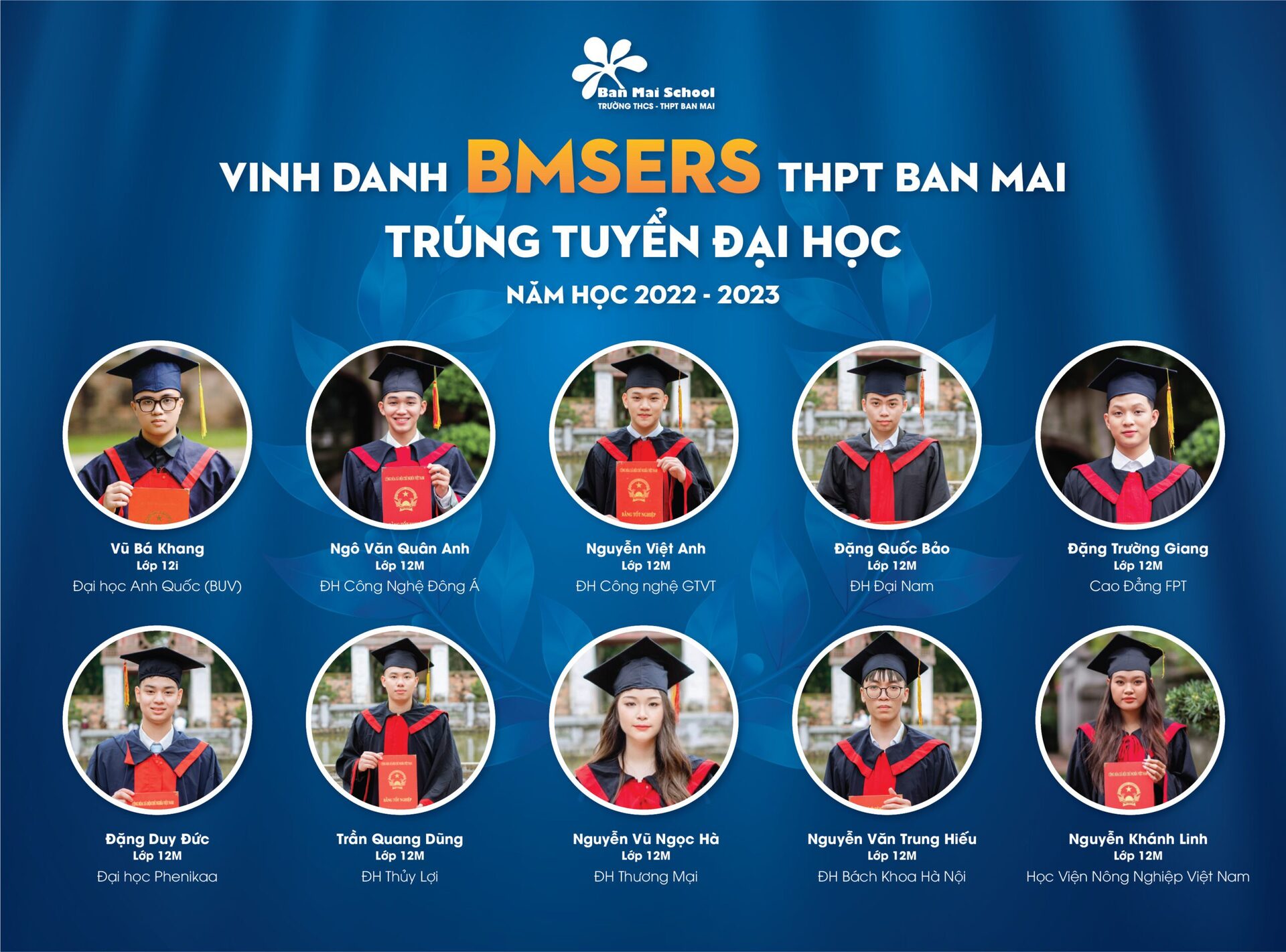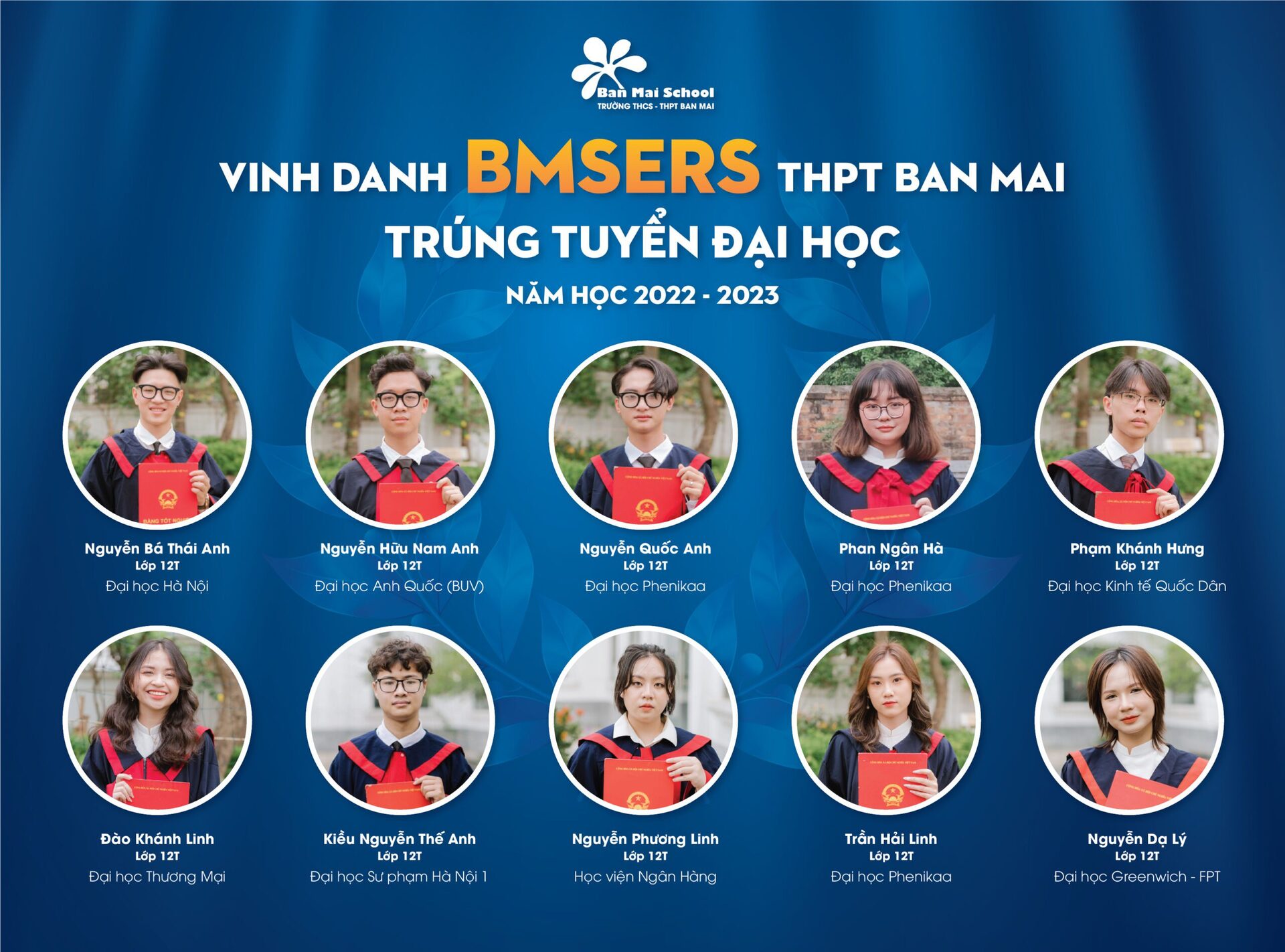 Năm học 2021 – 2022 của Trường THPT Ban Mai (Hà Đông) ghi dấu những thành tích đáng tự hào của Thầy và trò Nhà trường. Bên cạnh các huy chương, các giải thưởng học sinh giỏi các cấp trong nước và Quốc tế, Thầy cô chúc mừng và vinh danh các BMSers đạt thành tích cao: 100% học sinh đỗ tốt nghiệp THPT, 100% học sinh đỗ vào các trường ĐH, Cao đẳng và định hướng nghề. BMSers đã xuất sắc ghi danh vào các trường ĐH hàng đầu tại Việt Nam, trong đó có thể kể tới: ĐH Quốc gia Hà Nội, ĐH Bách Khoa, ĐH Ngoại Thương, ĐH Kinh tế Quốc dân, ĐH Hà Nội, ĐH Sư phạm, Học viện Ngân hàng,…