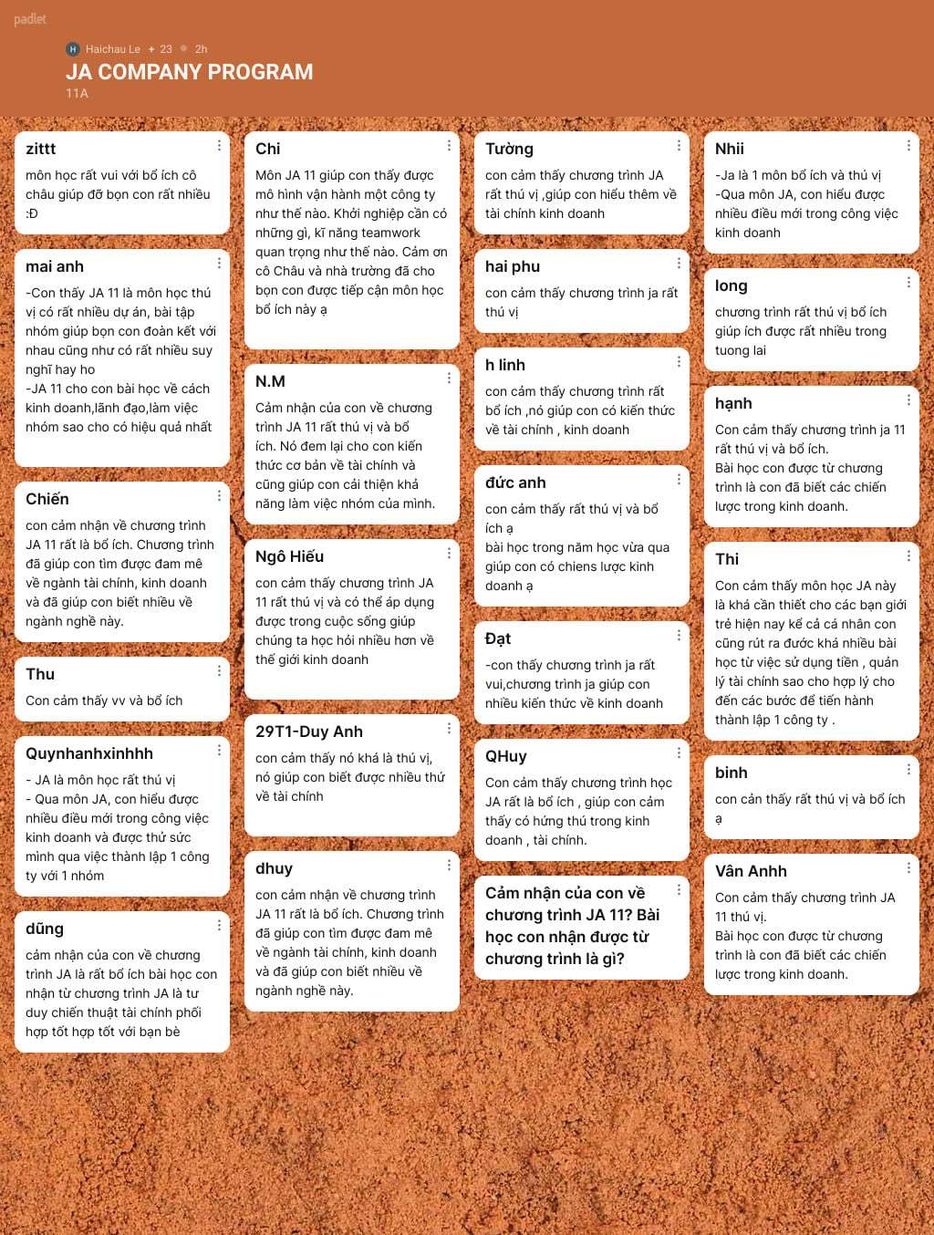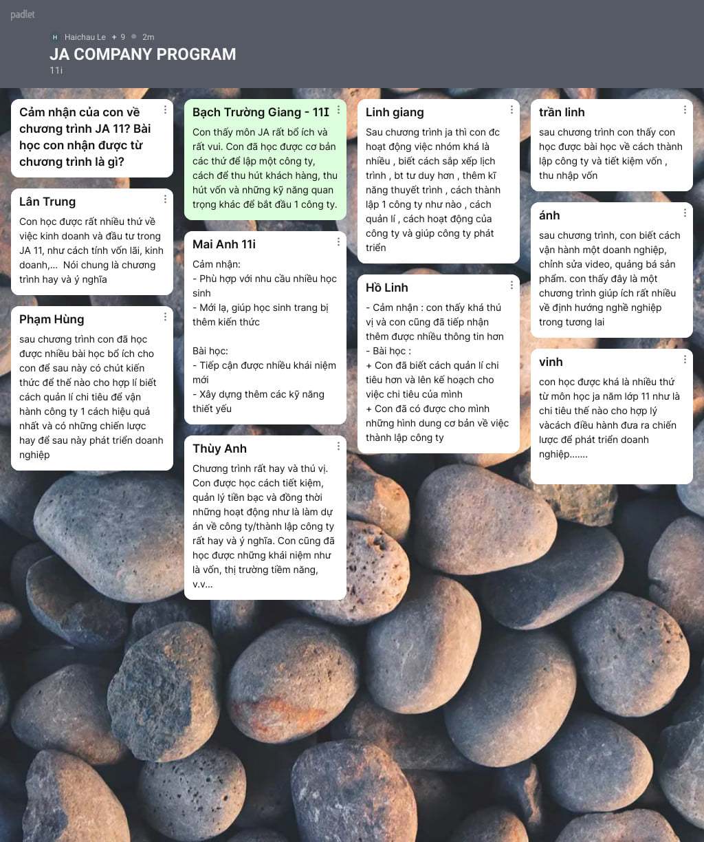 Sau 12 chủ đề của trình JA Company Program, các nhóm dự án đã có buổi báo cáo học tập cuối khoá với phương pháp thuyết trình dự án: phân tích thị trường, tìm hiểu khách hàng tiềm năng, thiết kế bộ nhận diện thương hiệu, lập mô hình kinh doanh, chiến lược quảng bá sản phẩm, cách thức huy động vốn…