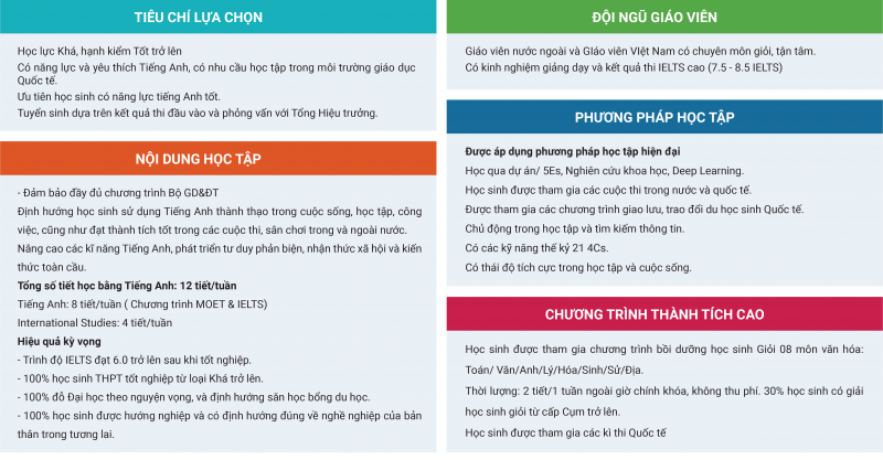 Với mô hình học tập nhiều sự lựa chọn, linh hoạt, đặc biệt quan trọng là giáo dục trong và ngoài lớp giúp học sinh tiếp thu tự nhiên, nhưng vẫn đồng nhất với tầm nhìn, sứ mệnh, triết lý giáo dục về ngôi trường quốc tế tôn trọng và đề cao văn hóa Việt.
