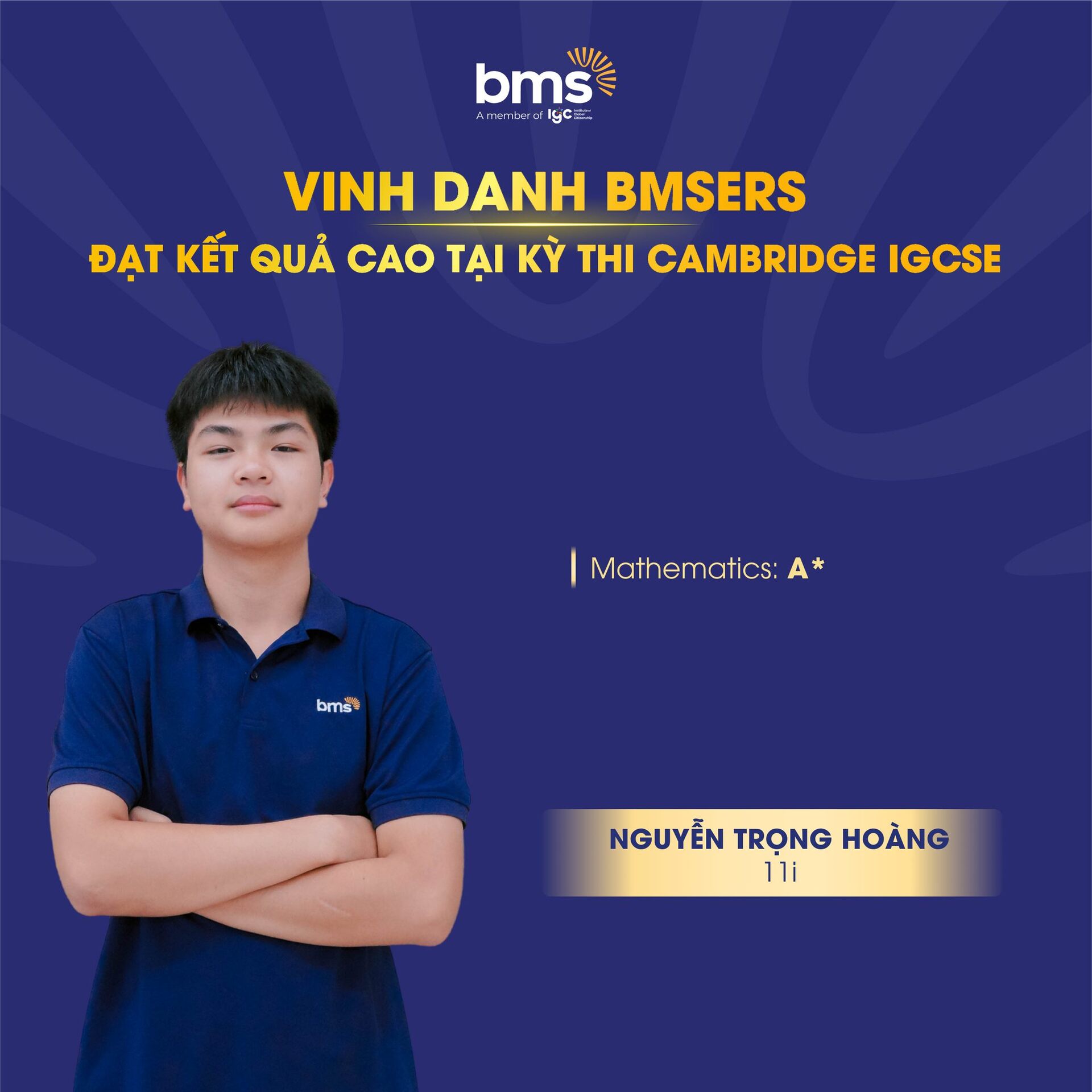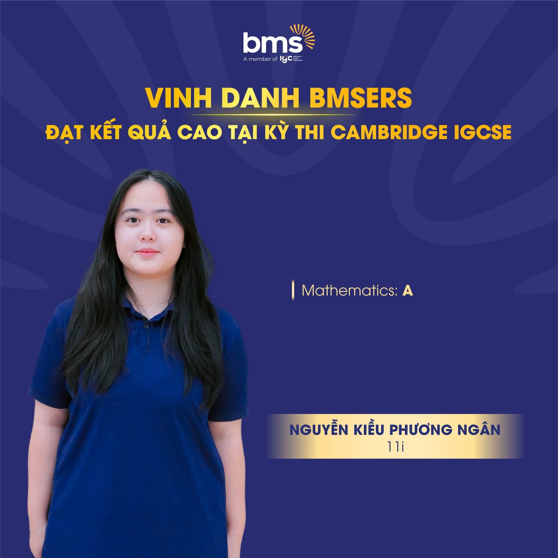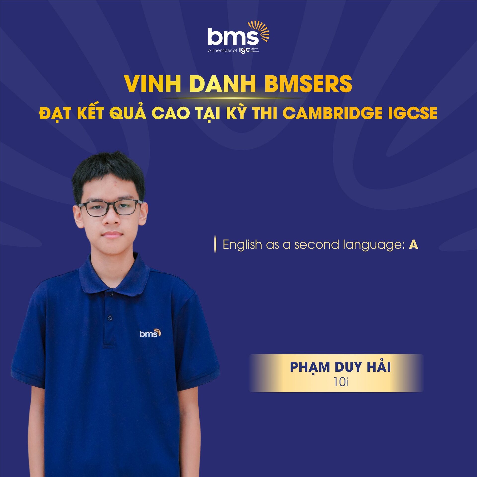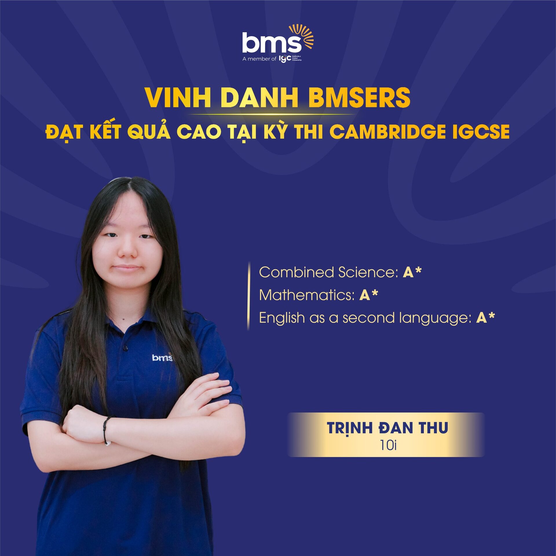 - Đặc biệt, BMSer Trịnh Đan Thu đã xuất sắc đạt trọn bộ điểm A* ở cả 3 môn gồm môn Mathematics, môn Combined Science và môn ESL.