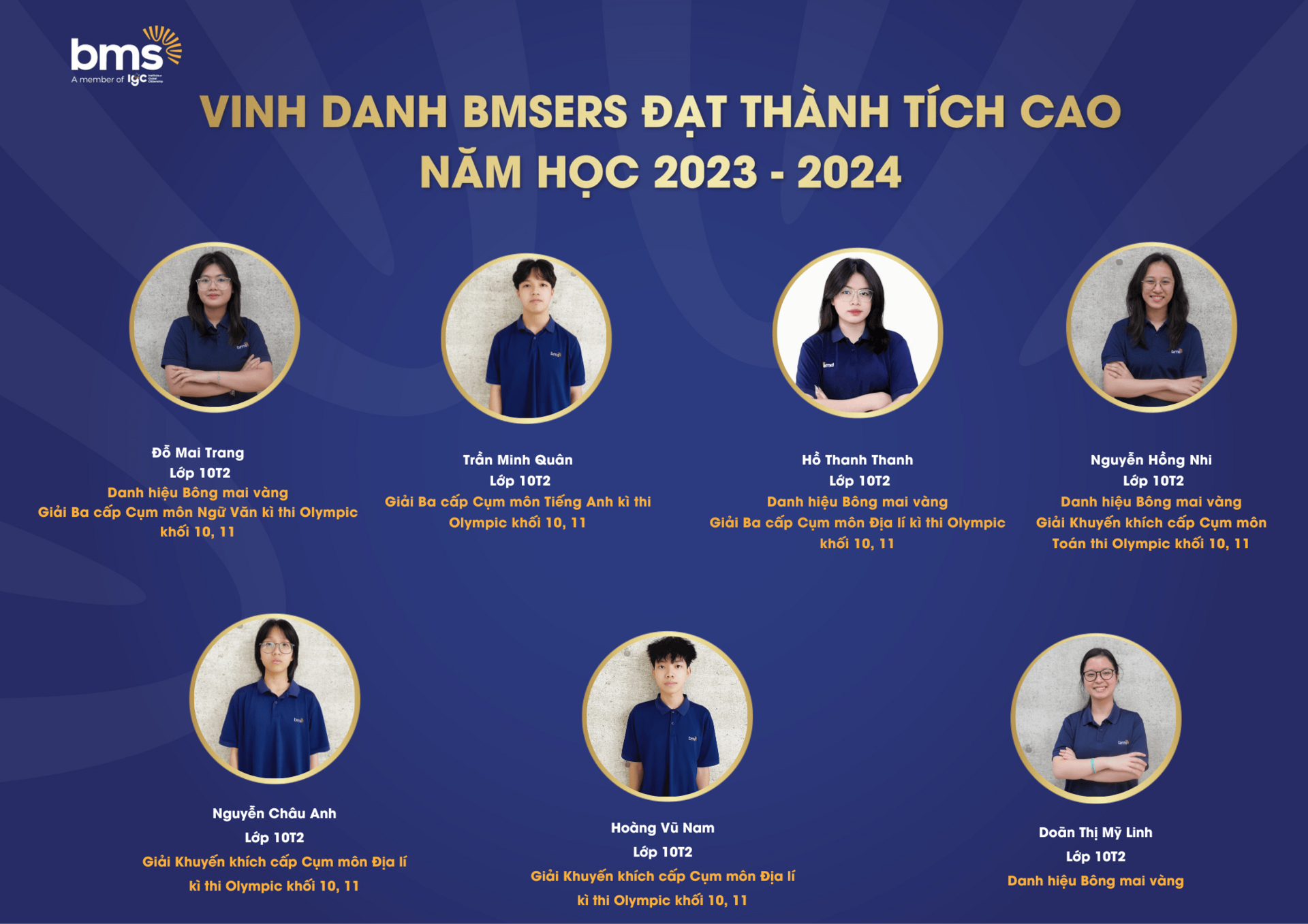 Trân trọng vinh danh các học sinh xuất sắc đã dành được nhiều thành tích cao trong năm học 2023 –2024. Chúc các bạn sẽ luôn vững vàng hành trang, tràn đầy tự tin, hứng khởi để cùng nhau tiếp tục viết nên câu chuyện thành công cho riêng mình và tiếp thêm động lực cho các BMSers kiên trì theo đuổi mục tiêu trên con đường học tập.