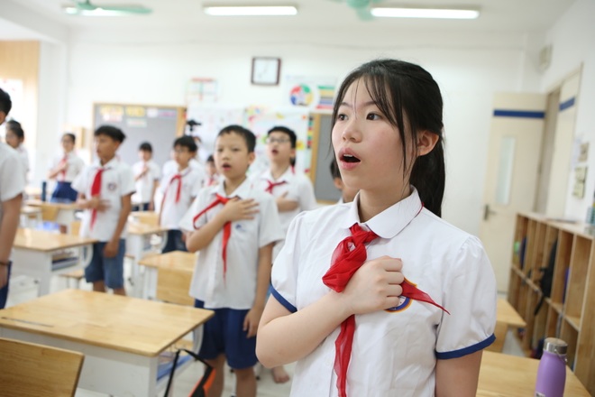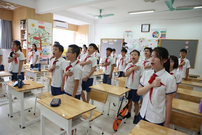 Để đảm bảo an toàn cho học sinh, trường không tổ chức lễ chào cờ tập trung mà cho các lớp thực hiện ngay trong phòng học.