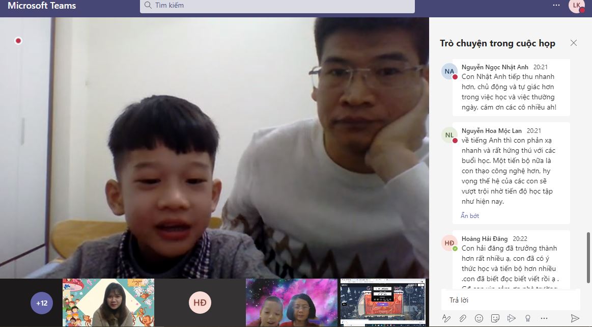 Về Tiếng Anh thì con phản xạ nhanh và rất hứng thú với các buổi học. Một tiến bộ nữa là con thạo công nghệ hơn. Hy vọng thế hệ của các con sẽ vượt trội nhờ tiến độ học tập như hiện nay”.