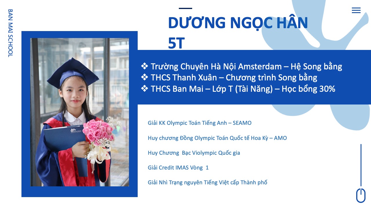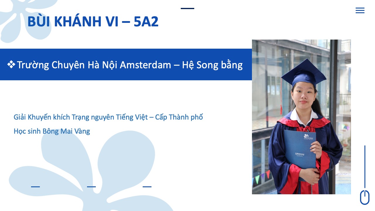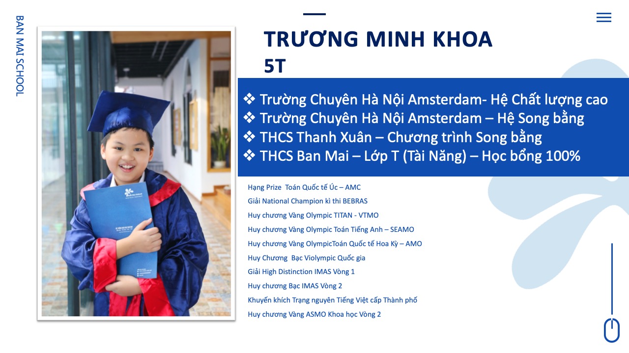 Cả 5 năm học con đều đạt danh hiệu Bông Mai Vàng và luôn nằm trong danh sách các học sinh tiêu biểu được Nhà trường vinh danh hàng năm. Con đã tham dự và đạt nhiều giải thưởng cao từ cấp trường đến cấp quốc tế. Và quan trọng nhất là con đã đạt số điểm cao thứ 19 trong tổng số hơn 3000 thí sinh tham gia kỳ thi vào hệ song bằng và chính thức trở thành thành viên của trường chuyên Hà Nội – Amsterdam theo đúng mục tiêu con đã đề ra khi bắt đầu năm học lớp 5.