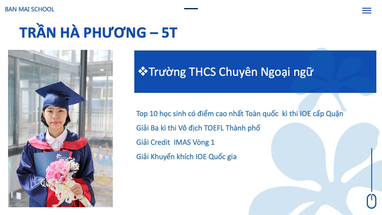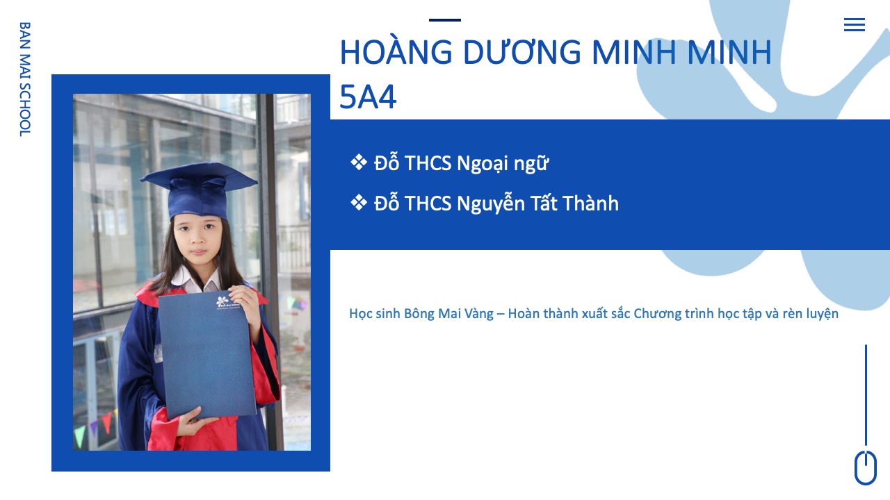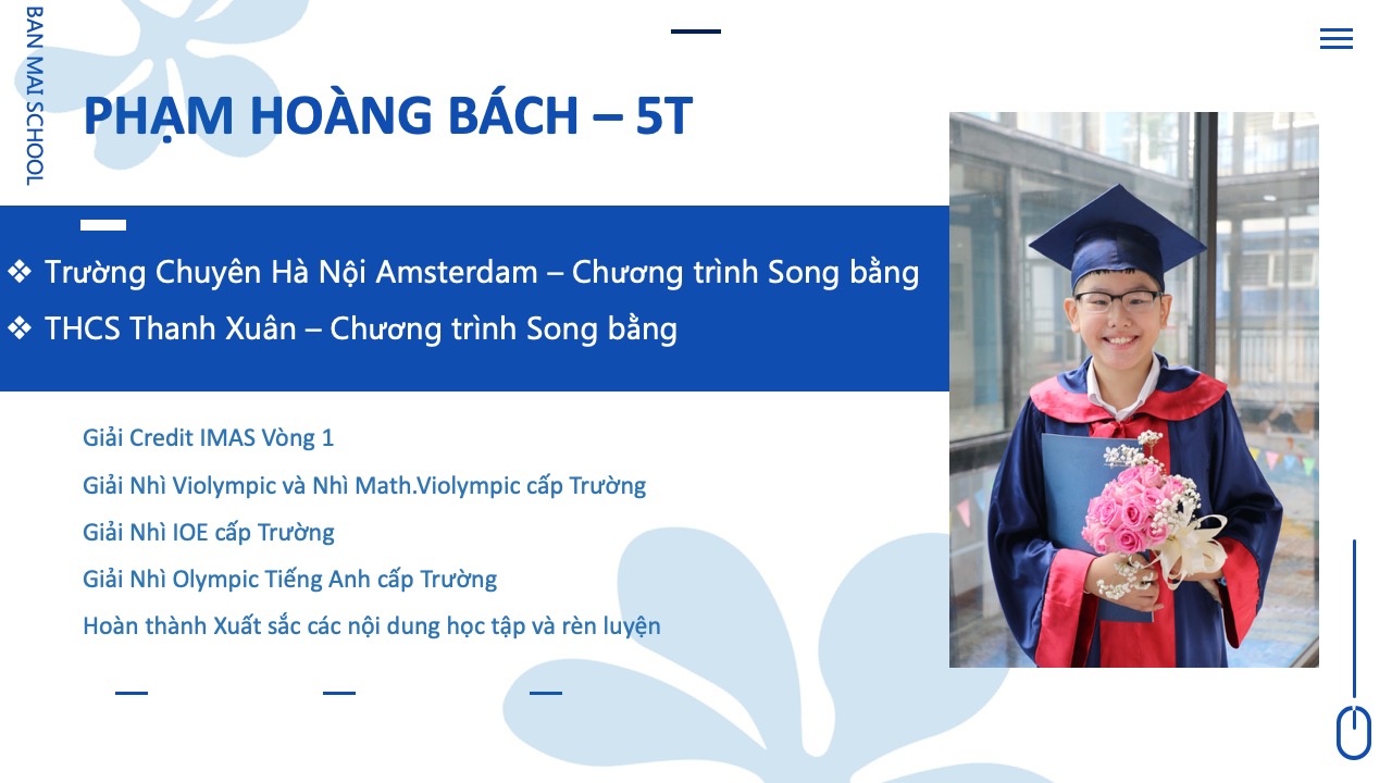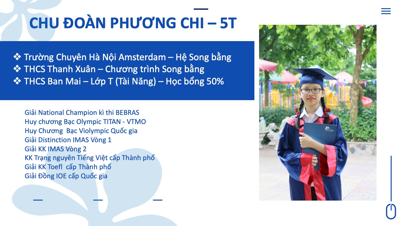 Cả 5 năm học con đều đạt danh hiệu Bông Mai Vàng và luôn nằm trong danh sách các học sinh tiêu biểu được Nhà trường vinh danh hàng năm. Con đã tham dự và đạt nhiều giải thưởng cao từ cấp trường đến cấp quốc tế. Và quan trọng nhất là con đã đạt số điểm cao thứ 19 trong tổng số hơn 3000 thí sinh tham gia kỳ thi vào hệ song bằng và chính thức trở thành thành viên của trường chuyên Hà Nội – Amsterdam theo đúng mục tiêu con đã đề ra khi bắt đầu năm học lớp 5.