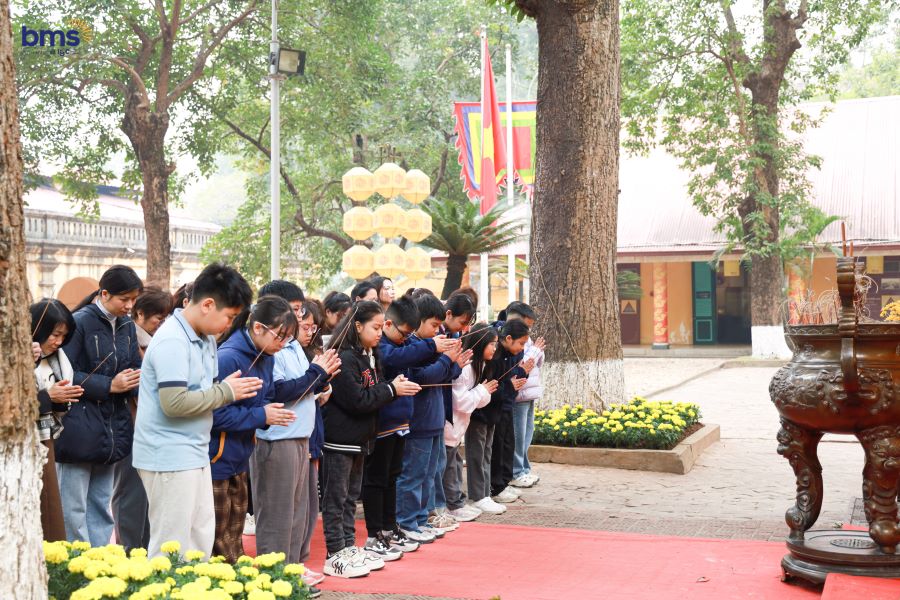 Ngay từ những bước chân đầu tiên vào khu di tích, không khí trang nghiêm và linh thiêng đã bao trùm toàn đoàn. Tại điện Kính Thiên, nơi được xem là trái tim của Hoàng thành, BMSers cùng Thầy cô giáo đã trang trọng thực hiện nghi thức Chào cờ và Nghi lễ dâng hương để tưởng nhớ công ơn của 52 vị Tiên đế tiền triều. Khoảnh khắc ấy không chỉ là lời nhắc nhở các con về công lao dựng nước và giữ nước của cha ông, mà còn gieo vào lòng các con trách nhiệm gìn giữ và phát huy những giá trị cao đẹp mà tổ tiên đã để lại.