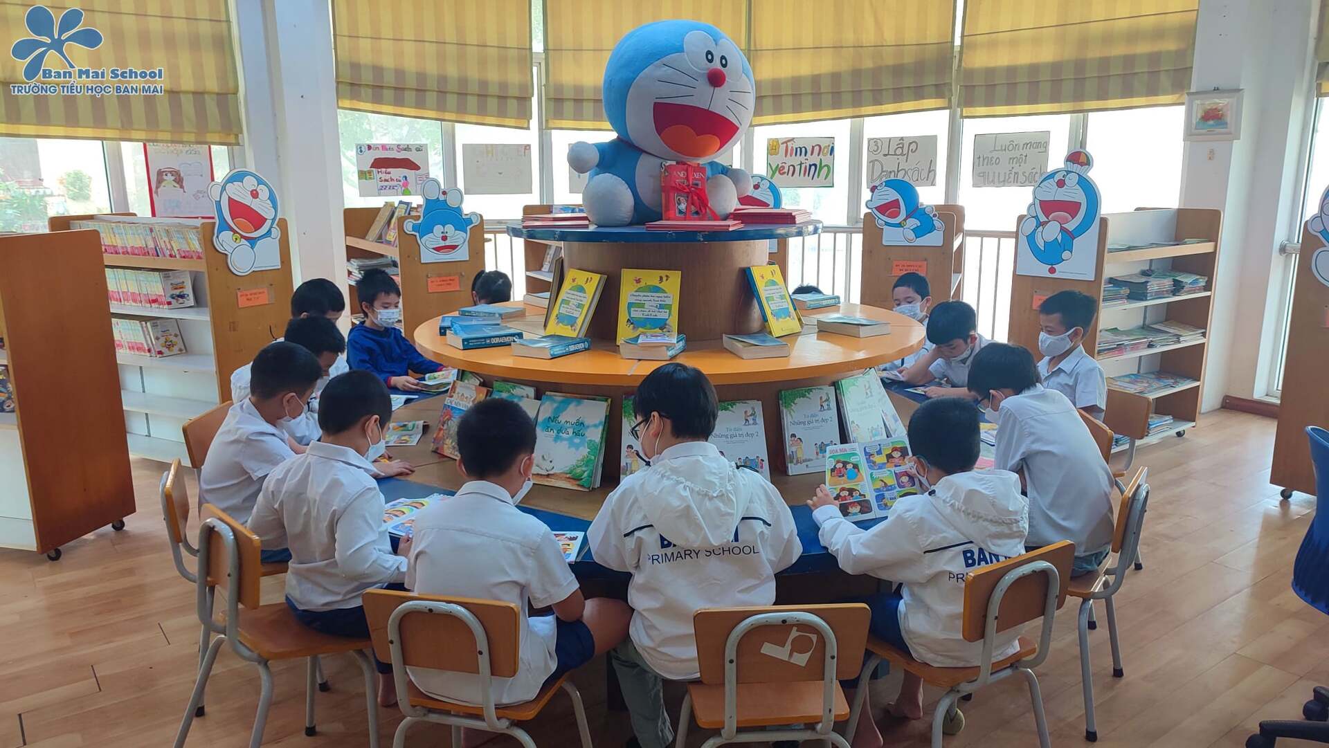 Tại không gian thư viện với hình ảnh chú mèo máy Doraemon nhún nhảy khắp nơi, chúng con say sưa đọc sách.