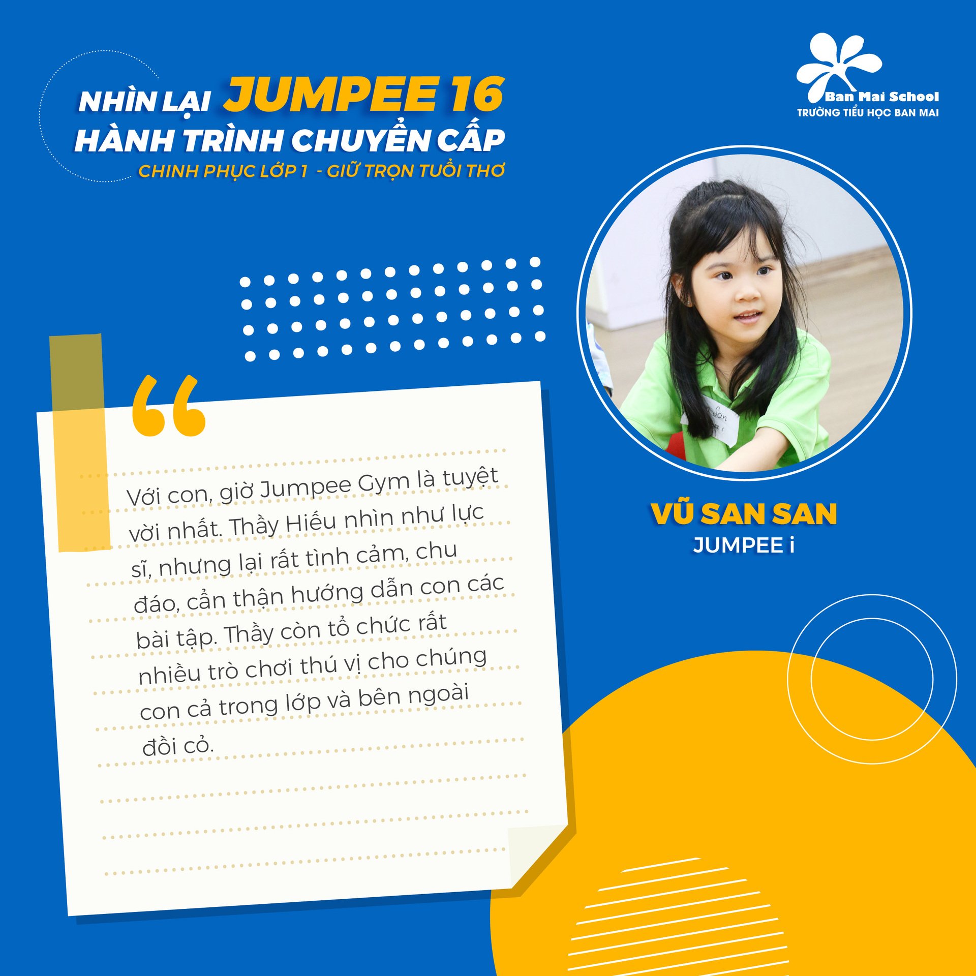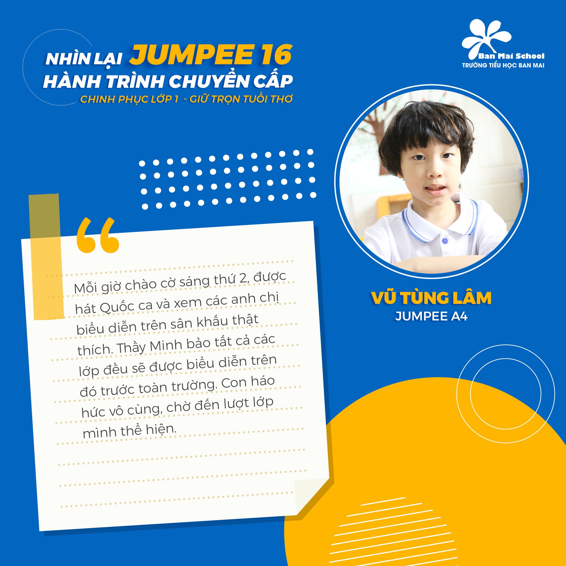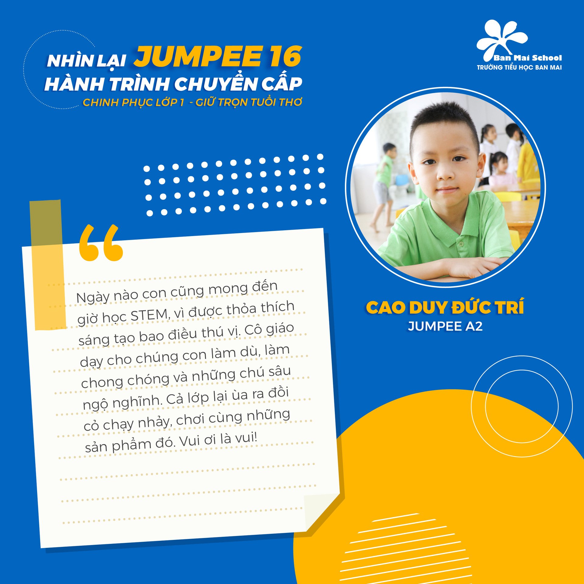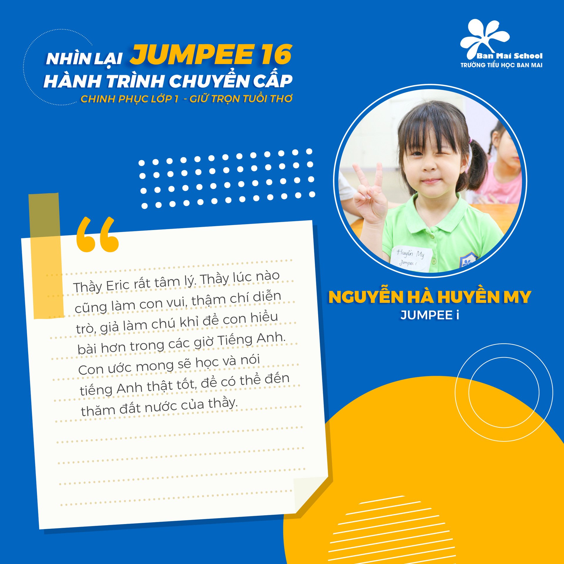 Kính mời bố mẹ cùng lắng nghe các BMSers khối Jumpee nói về LỚP HỌC HẠNH PHÚC của chính mình trên hành trình chuyển cấp chinh phục thành công. Thầy cô tự hào khi thấy các con thực sự trưởng thành với những hành trang vững chắc, sẵn sàng tâm thái bước vào lớp 1.