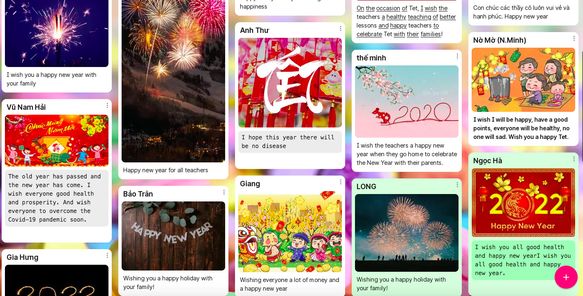 Bên cạnh đó các con cũng được khuyến khích chủ động chia sẻ và kể về hoạt động của chính gia đình mình. Sự đóng góp của các con với gia đình trong ngày Tết để các con thêm hiểu giá trị của việc sẻ chia, san sẻ công việc giữa các thành viên trong gia đình.Sau mỗi giờ học các được chia sẻ hình ảnh lời chúc gia đình trên trang Padlet để cùng nhau nhìn ngắm lại những mong muốn của mình trong năm tới và cùng nhau nỗ lực cố gắng để có thể đạt được mục tiêu.