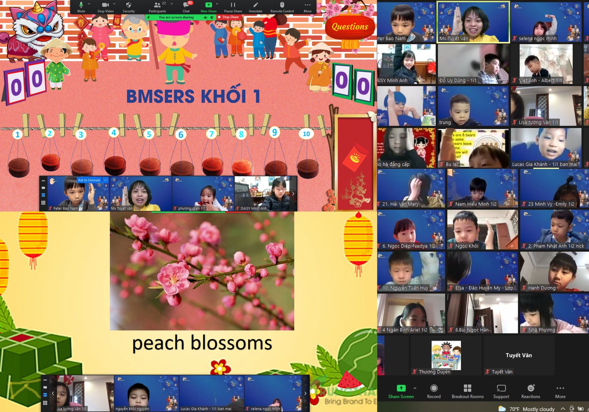 Nhuộm đỏ không gian lớp học online với những phông nền đậm màu sắc Tết,, các BMSers đã đón Tết sớm qua những giờ học Tiếng Anh đầy sôi nổi, hào hứng traong tuần học cuối cùng của năm Tân Sửu cùng những nội dung học tập theo chủ điểm “Bên nhau là Tết”.