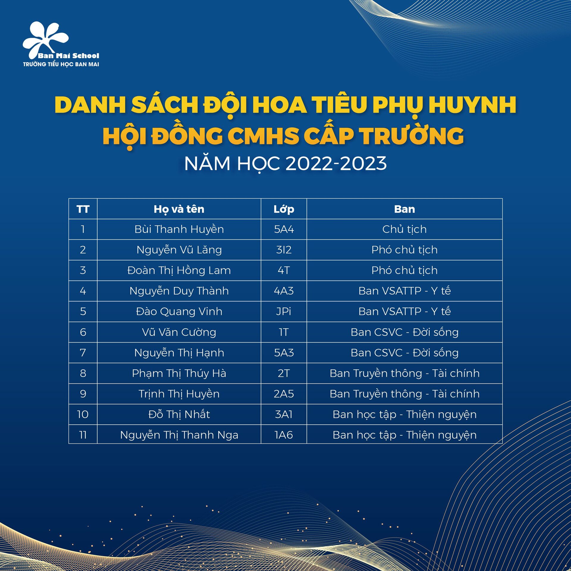 Chúc mừng các bố mẹ đã được tín nhiệm bầu vào đội Hoa tiêu phụ huynh – Hội đồng Cha Mẹ học sinh (HĐCMHS) cấp trường năm học 2022 – 2023.