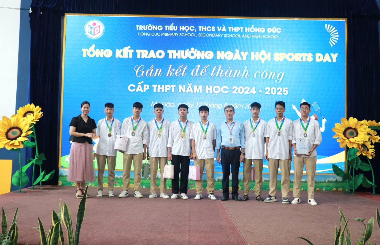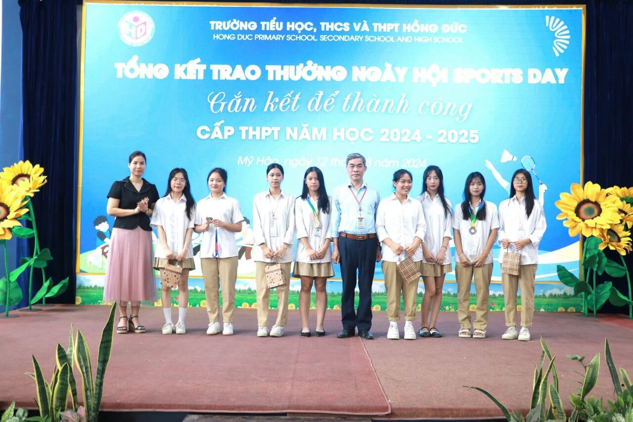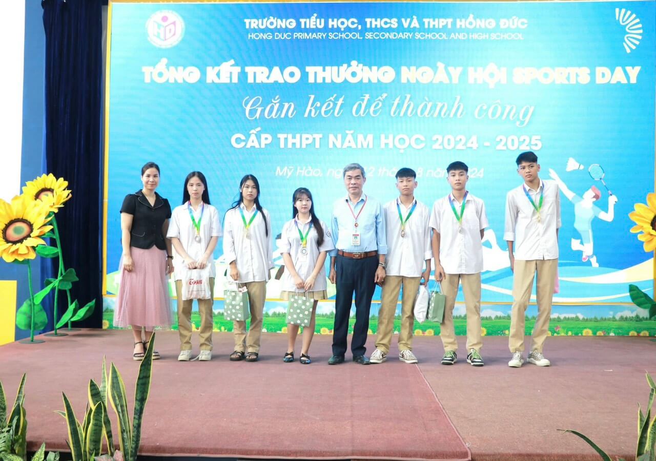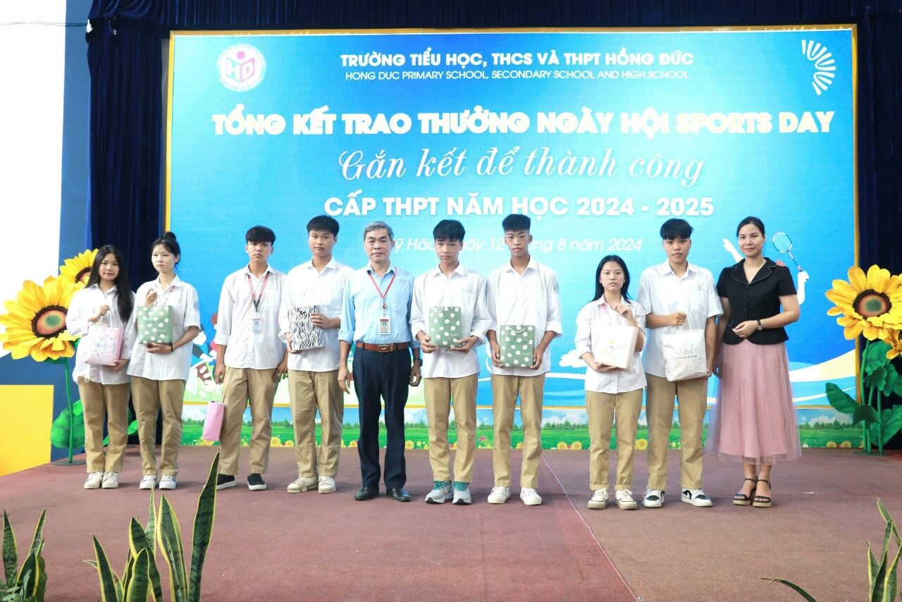 Đại diện thầy Nguyễn Văn Tuynh – Hiệu trưởng trường liên cấp TH, THCS-THPT Hồng Đức và cô Tạ Minh Thủy – Hiệu phó THCS-THPT lên trao thưởng cho các cá nhân, tập thể có thành tích nổi bật nhất: